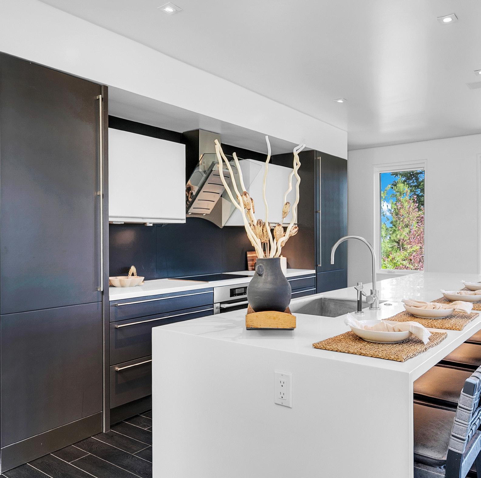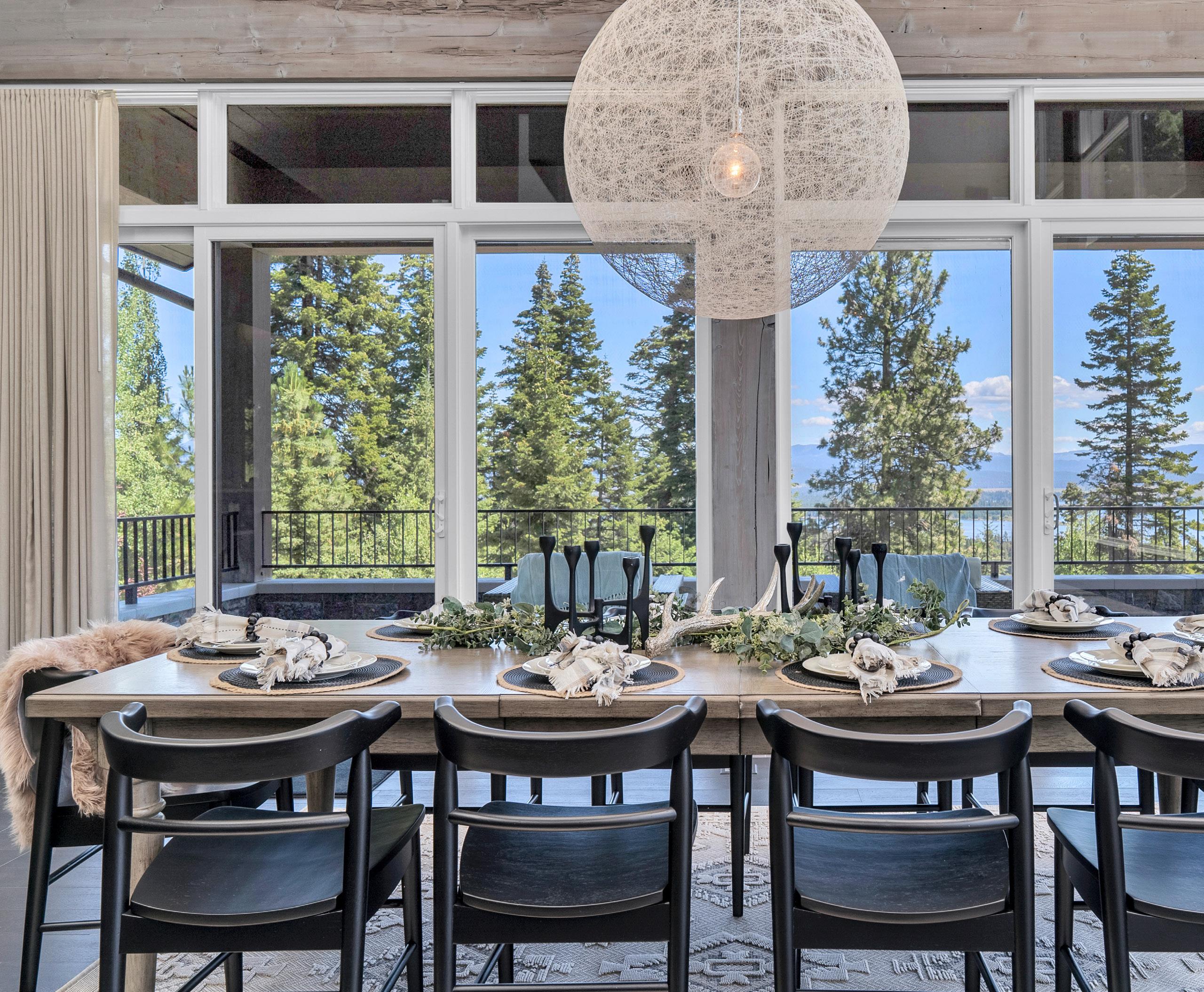 Inside, the great room is both expansive and intimate—framed by soaring ceilings and panoramic windows that capture protected vistas reaching toward the iconic “Land of No Return” wilderness. The custom kitchen, crafted by Studio Becker and appointed with top-tier Miele appliances, is a refined culinary space tailored for both elevated entertaining and everyday moments.