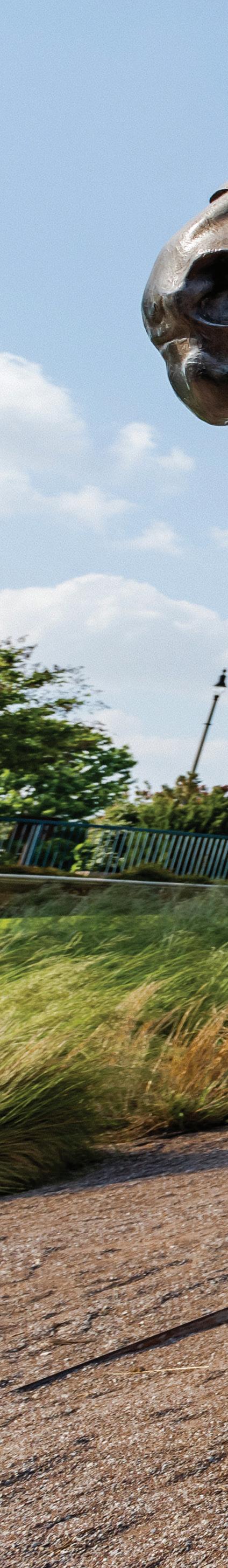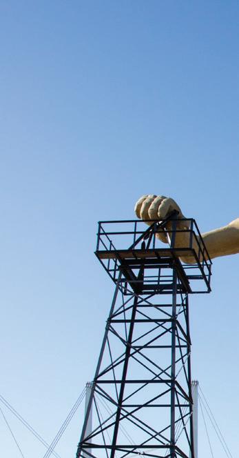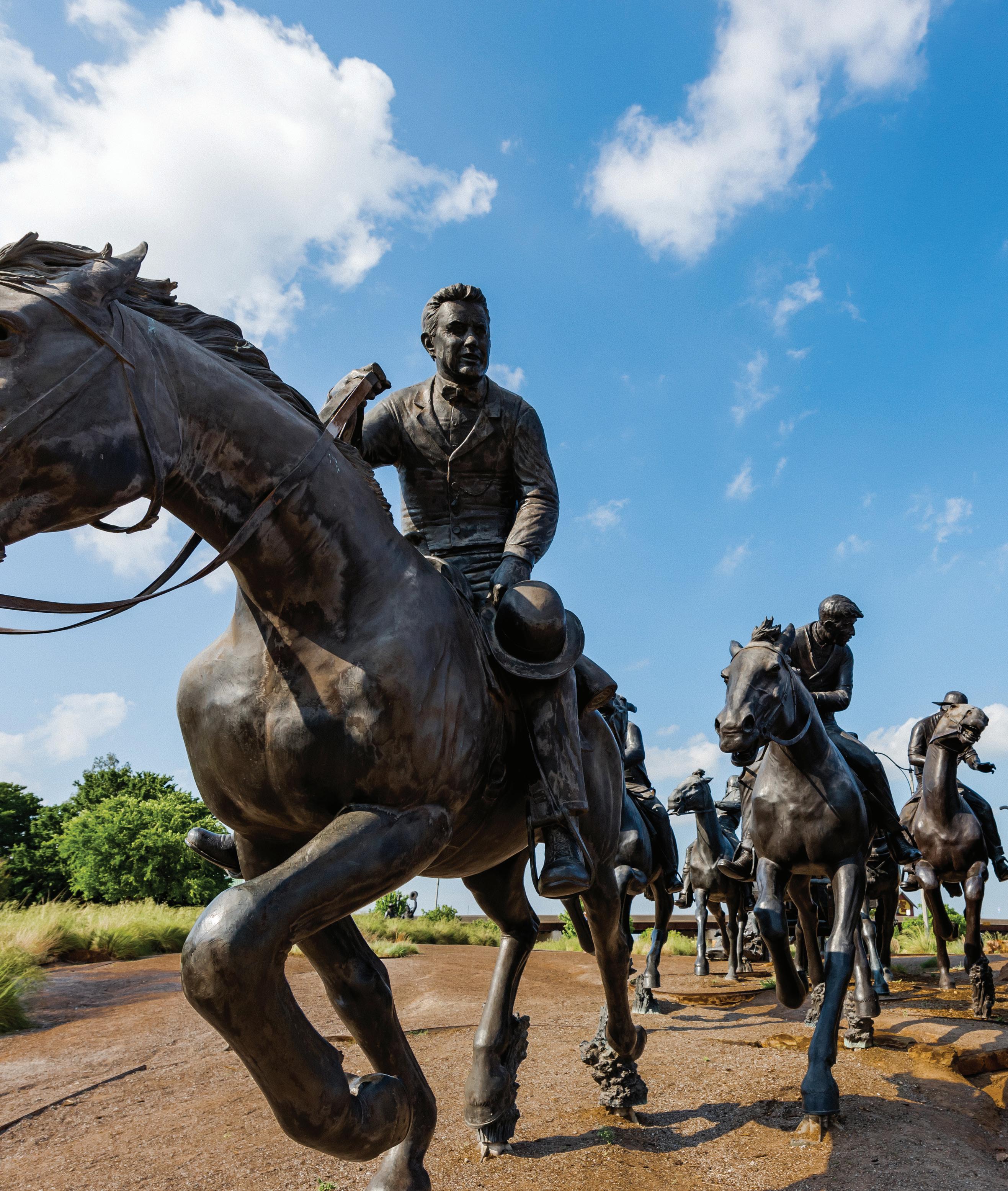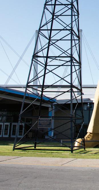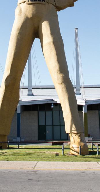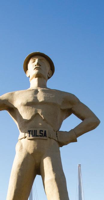 A trip through Oklahoma would be incomplete without a visit to one of its most unique and im pressive monuments. The Golden Driller, a 76-foot-tall, 43,500-pound statue of an oil worker, was first erected in 1953 for the International Petroleum Exposition. The statue’s right hand rests on a real oil derrick. It was later donated to Tulsa’s fairgrounds, where it stands today in Expo Square as a tribute to Oklahoma’s oil workers and the oil industry’s contributions to Oklahoma’s economy. The steel-framed concrete and plaster statue is one of the tallest freestand ing statues in the United States. Groups can stop for a photo-op with Oklahoma’s official monument and learn about the history be hind it. Those visiting in the fall can check out the Tulsa State Fair in the Tulsa Expo Center where the monument resides. travelok.com