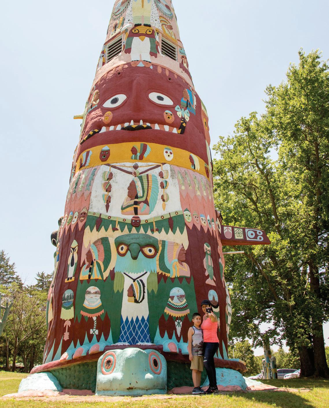 in the park have been restored over time, including the world’s largest concrete totem pole, the park’s 90-foot-tall centerpiece. Groups can peruse the nine-acre property and visit the park’s museum, which features Galloway’s hand-carved fiddles and other artworks and gives insight into his vision for the park.
