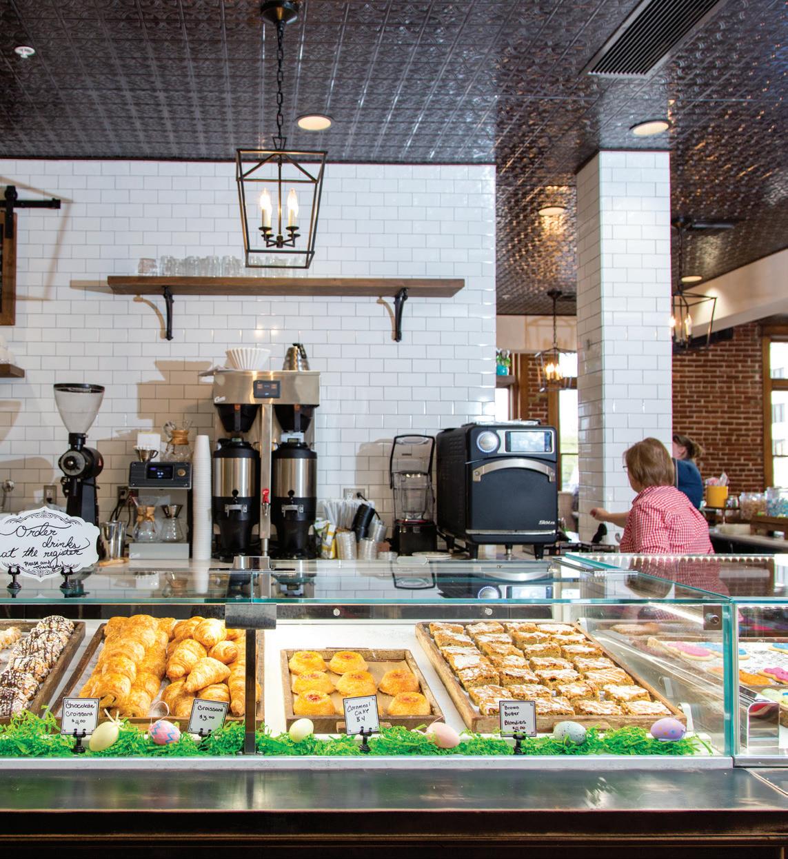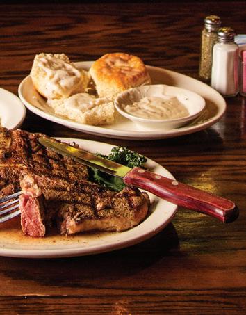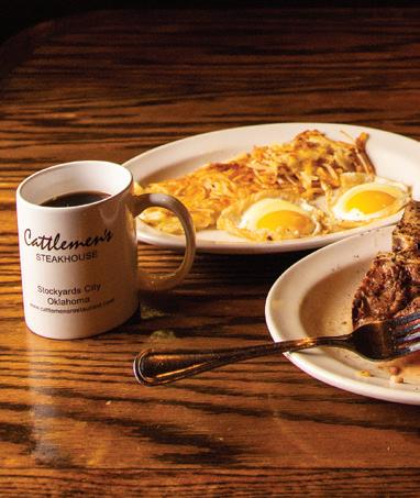 more. The Merc serves up hearty country break fasts, offering everything from pancakes to grits. The Cattleman’s Breakfast, featuring a 12-ounce ribeye, eggs, potatoes and a biscuit, is a tasty re minder of Oklahoma’s role in the beef industry. The restaurant is also well known for its lunch and din ner options such as chicken fried steak, and shrimp and grits. The building’s bakery is notorious for its cinnamon rolls, sticky buns and freshly baked pecan pie, which visitors can enjoy with a cup of coffee.