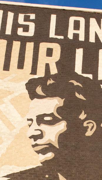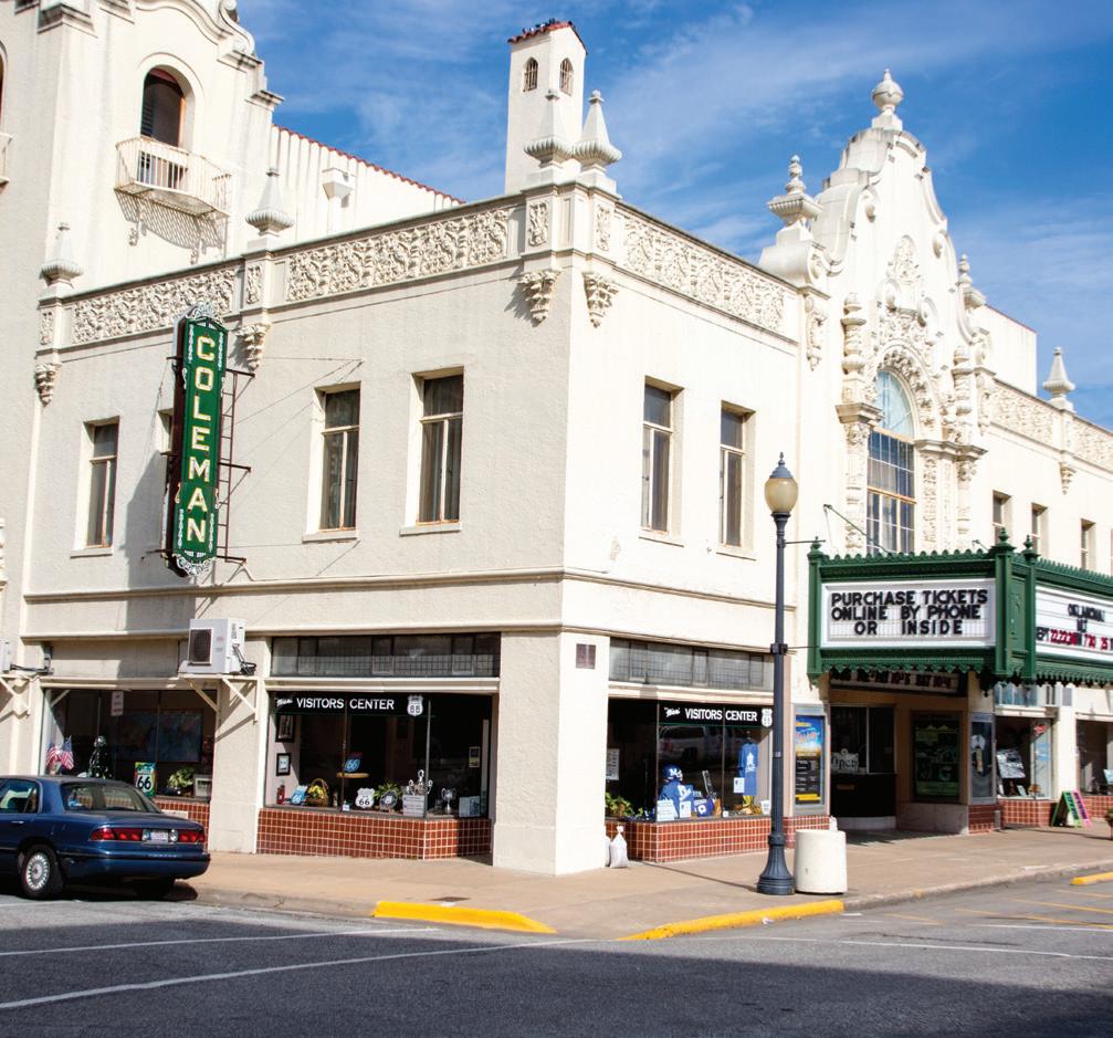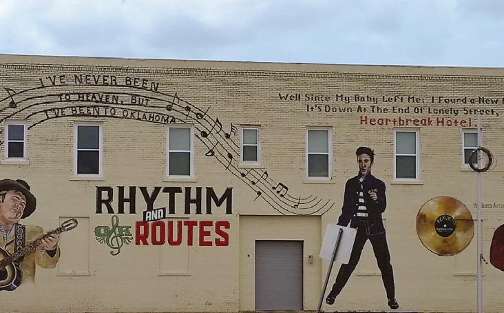 In downtown Duncan, Oklahoma, on the side of the his toric Henderson Furniture building, a mural was com missioned in 2015 to display Oklahoma’s passion for its musical roots. The mural features Hoyt Axton, a singer-song writer known for penning songs such as “Joy to the World” and “Greenback Dollar,” playing his guitar. A line about Oklahoma from his song “Never Been to Spain” is painted above him. Ax ton’s mother, Mae Boren Axton, is also portrayed in the mural. She was a songwriter who co-wrote hits such as Elvis Presley’s “Heartbreak Hotel.” Duncan was Hoyt Axton’s hometown, and he and his mother spent many years here. This artful display honors their legacy and their contributions to music and Okla homa. Groups can stop at the mural for a photo op and then take their time exploring the antique shops, restaurants and historic buildings of downtown Duncan.