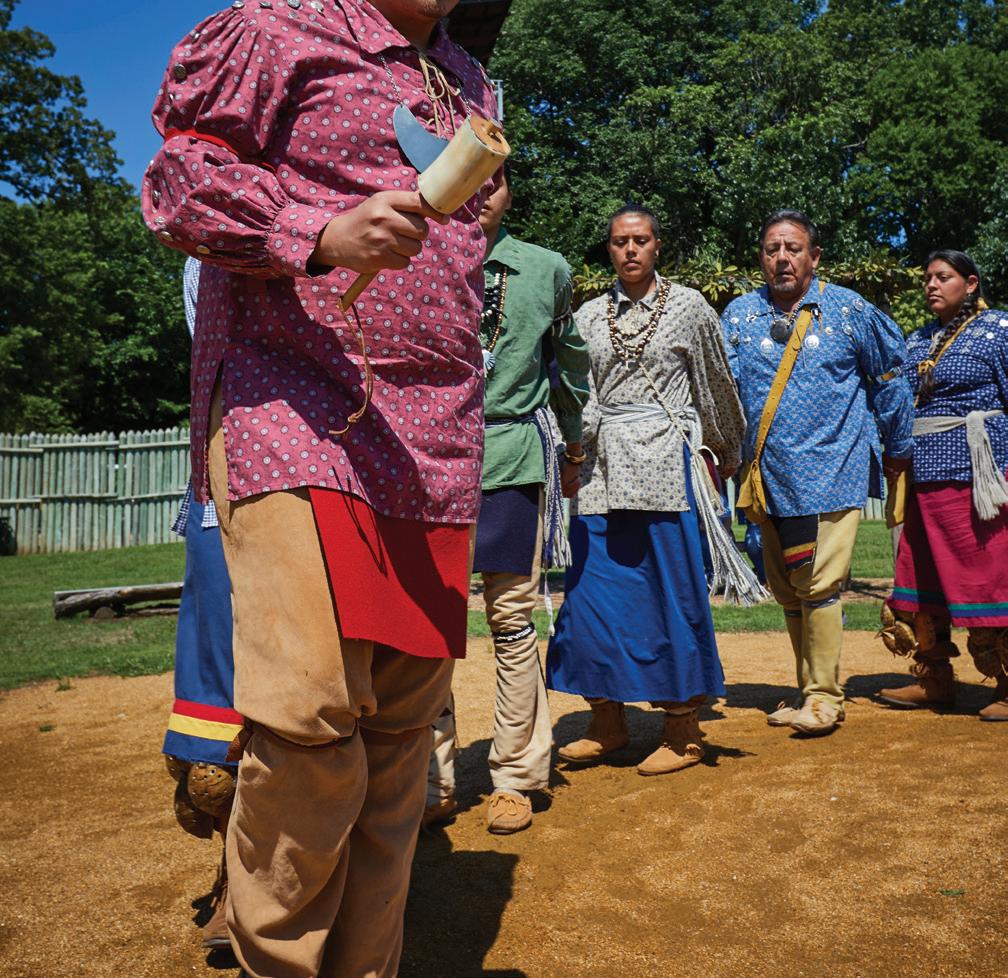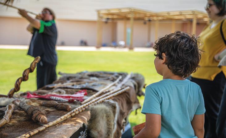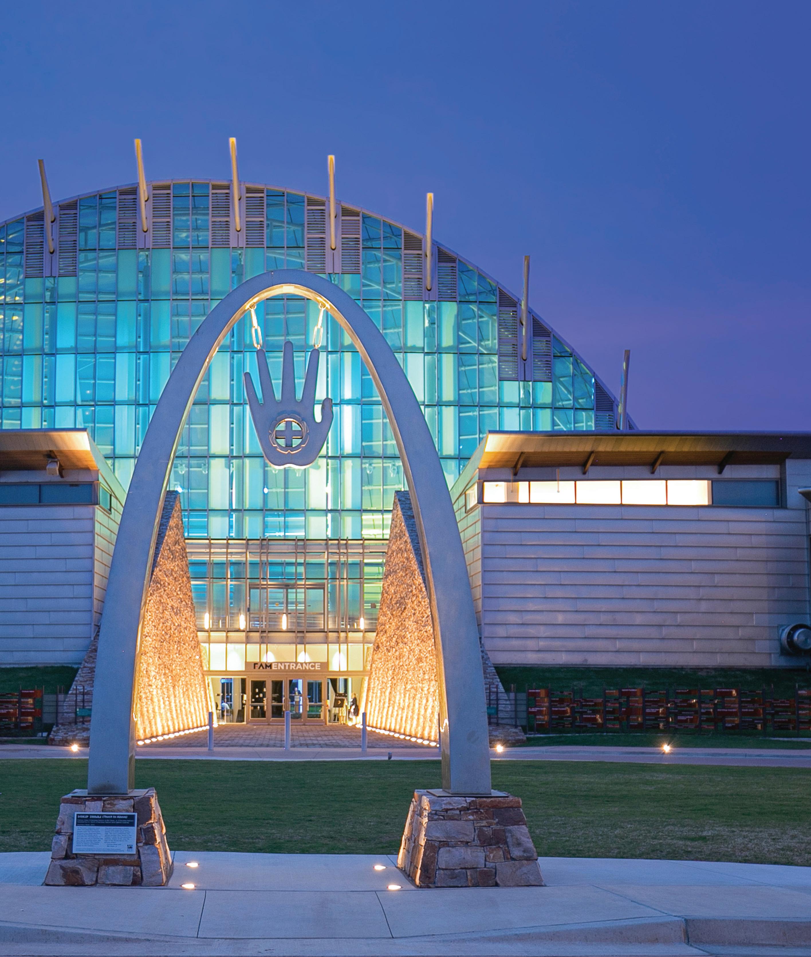 The name “Oklahoma” comes from two Choctaw words, “okla” and “homma,” which mean “red people.” However, the Choctaw originated from the Natchez Trace region in Alabama and Mississippi and were later removed during the 19th century. The Choctaw people were renowned for their skill in agriculture and trade and were also impressive war riors. The Choctaw Cultural Center, which opened in 2021, uses interactive exhibits and 100,000 square feet of space to tell the story of the Choctaw people. In the museum’s main exhibit space, groups will find various galleries and exhibits that explain the origins of the Choctaw and their history, as well as informa tion about the Choctaw Nation today. In the museum’s Living Village, visitors can walk through a re-creation of a Choctaw vil lage to see dwellings and demonstrations of Choctaw traditions, including stickball and dances. Films by and about the Choctaw people play in the museum’s theater, and visitors can try some delicious traditional Choctaw recipes, as well as some modern fare, in the Champuli Café
