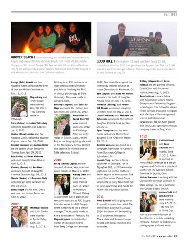 2012 Caitlin Friihauf and Adam Swanson were married June 2, 2012. Adam is working at Honda R&D Americas as a design engineer and Caitlin is a preschool teacher at The Goddard School. They live in Dublin, Ohio. Michael Swanson is working with the Coalition for Christian Outreach in State College, Pa. He is partnered with Calvary Baptist Church. Autumn Todd and Josh Kern ’13 were married June 27, 2013. They now live in Grove City. Josh is a co-owner/founder of BuzzBurrito, a mobile marketing company. Autumn is working as a photographer and food writer.