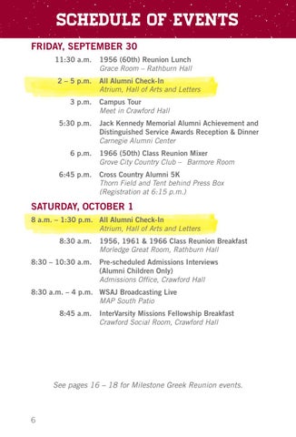 SATURDAY, OCTOBER 1 a.m. – 1:30 p.m. All Alumni Check-In 8 Atrium, Hall of Arts and Letters 8:30 a.m. 1956, 1961 & 1966 Class Reunion Breakfast Morledge Great Room, Rathburn Hall 8:30 – 10:30 a.m. Pre-scheduled Admissions Interviews (Alumni Children Only) Admissions Office, Crawford Hall :30 a.m. – 4 p.m. WSAJ Broadcasting Live 8 MAP South Patio 8:45 a.m. InterVarsity Missions Fellowship Breakfast Crawford Social Room, Crawford Hall