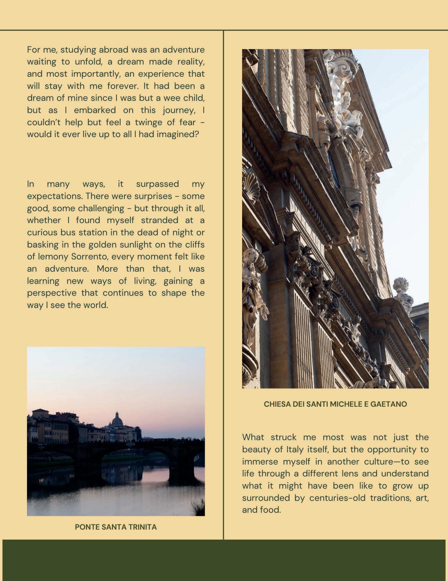 I have always known that I wanted to study abroad in college. Throughout my childhood, I traveled a lot with my family, which instilled in me a love for experiencing new things and interacting with different cultures. Yet, in the months leading up to studying abroad, I had conflicted feelings as it began to feel real. I was unsureifitwastherightsteptotake.So,Iprayed toGodalot,askingforpeaceandguidance.After much uncertainty, I clearly heard “Go and I will be with you.” These words stuck with me all throughout my travels and even now when I am back.