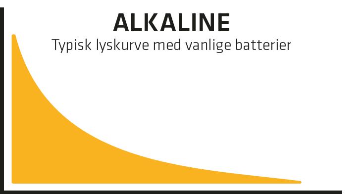 å vite hvor lenge en lykt gir et godt, jevnt og riktig arbeidslys enn hva som er maksimal lysstyrke. I grafene under viser vi hvordan lysstyrken opptrer ved bruk av ulike batterityper.