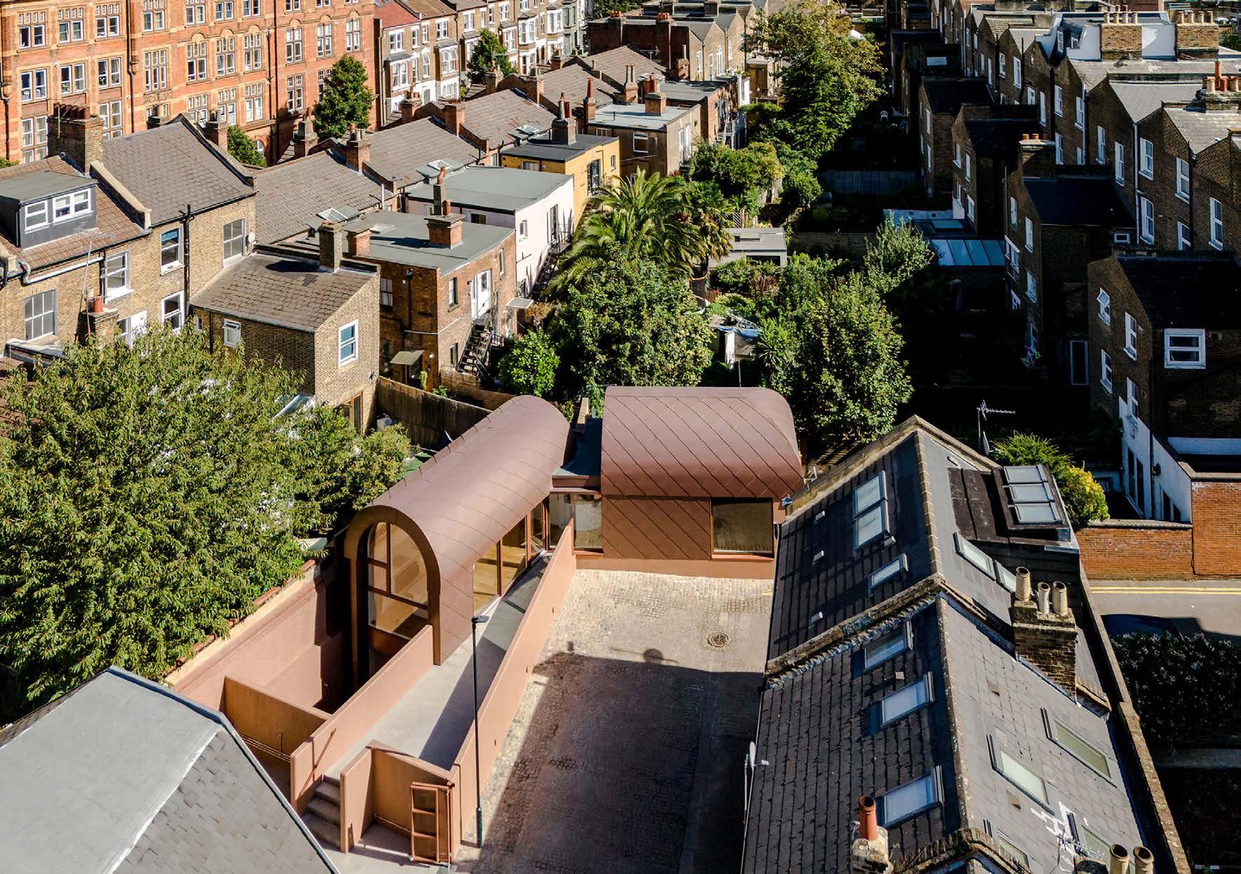 Refined material palette, thoughtful density, and landscape integration establish new benchmark for the area. Two cedar-clad buildings echo Victorian scale and massing whilst introducing crafted detailing that ages gracefully - housing four maisonettes. Five single-storey glass pavilions with sedum roofs sit beyond, invisible from above, forming communal courtyard whilst maximizing daylight.