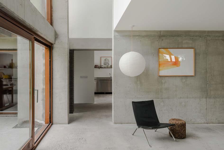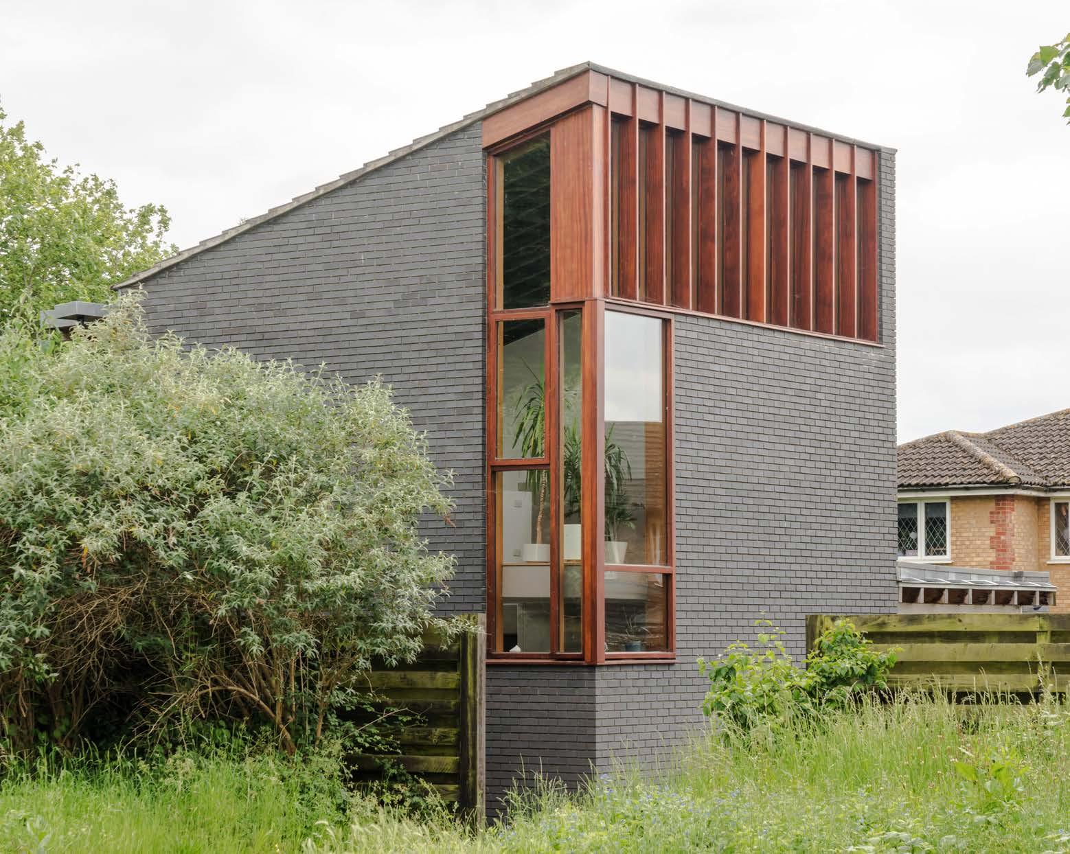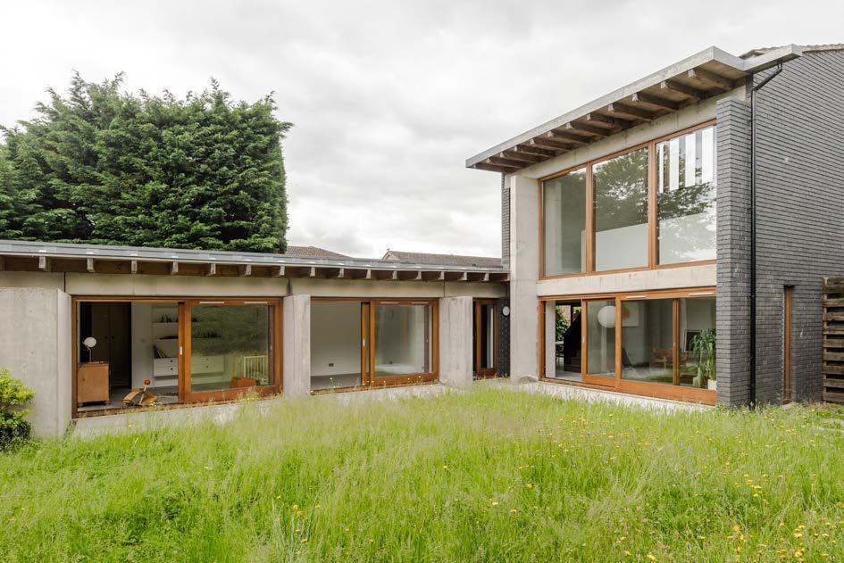 L-shaped plan frames sheltered courtyard, architecture deferring to nature. Double-height communal and single-storey private wings maximize garden connection and light. Blue brick and sapele complement landscape. Exposed concrete structure and raw materials create fresh, contemporary interiors celebrating honest construction. Quality of living with nature generates premium value.