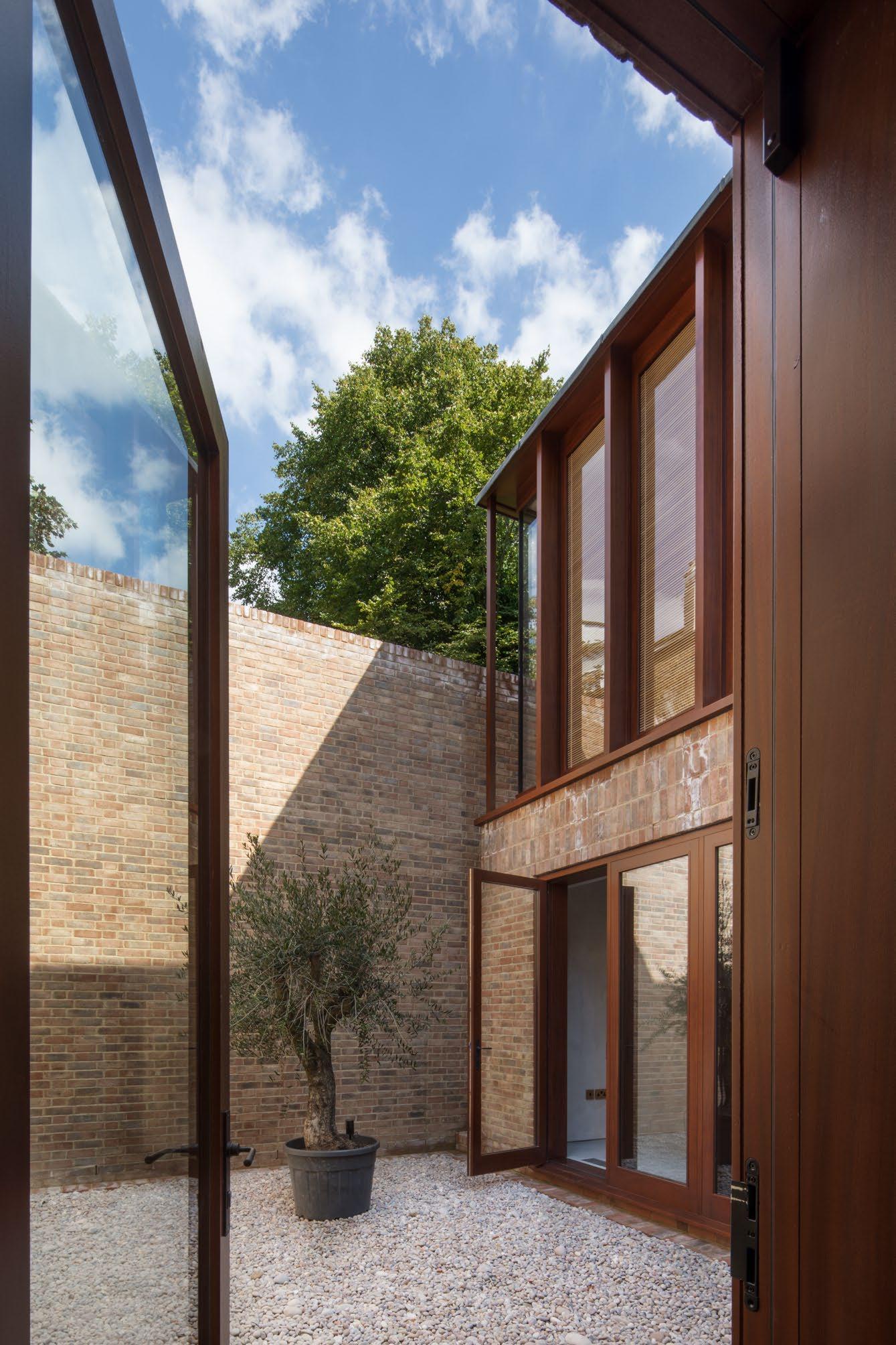 upper courtyard sapele timber-framed window joinery forming the structure of the building at ground floor level; view from upper courtyard into living