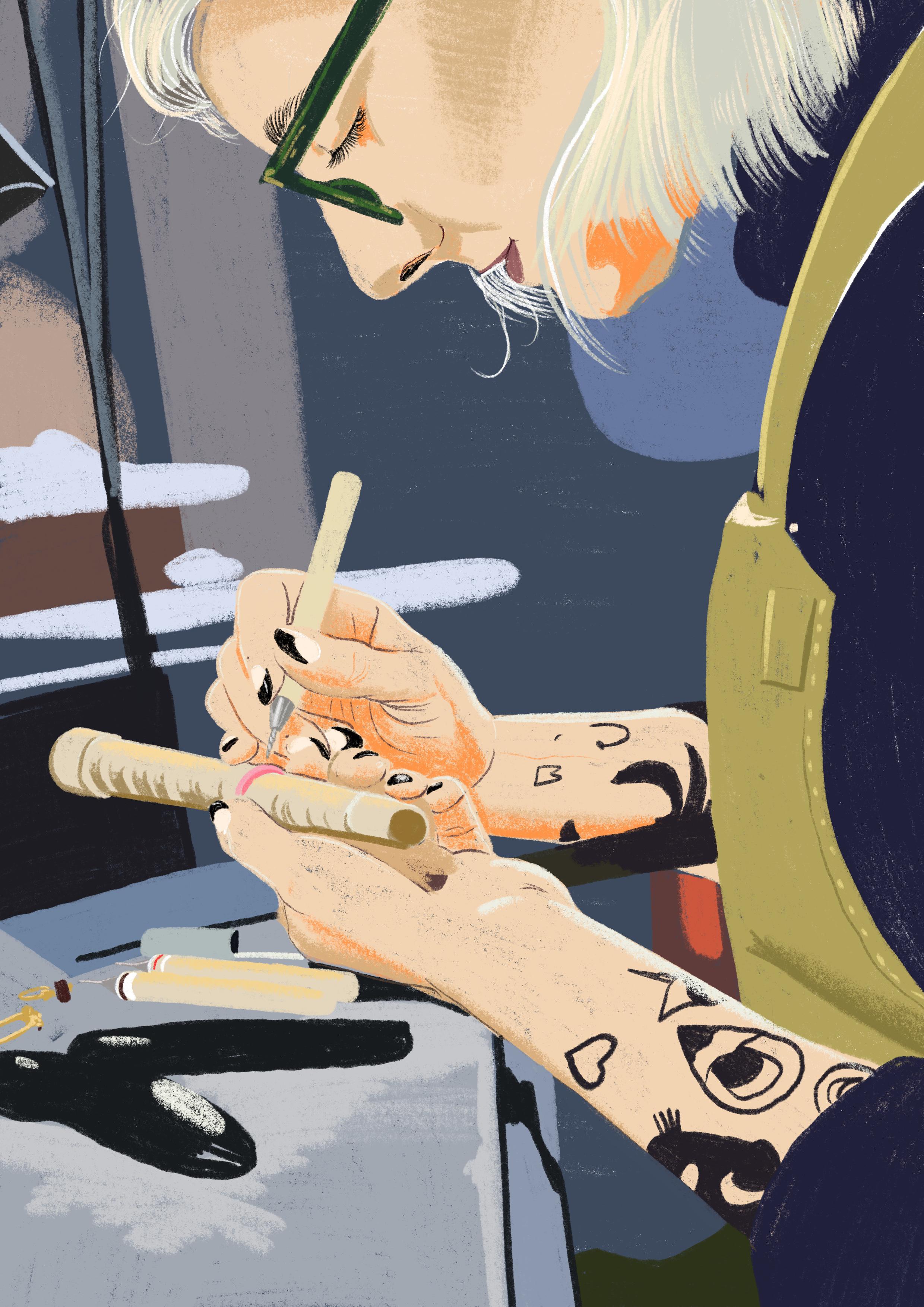 Do you have a favourite piece you’ve worked on? “I love the custom work. It’s not all mourning, I am frequently commiss ioned to create an engagement r ing or wedding band that incorporates the love and loss they’ve experienced in life. There is a particular mourning piec e that comes to mind. A young woman c ontacted me asking to create an ashes reliquary piece for her father who took his own life. She reques ted his ashes be set in a noose. Grieving a stigmatised death such as suicide or an overdose can be especially hard. I tend to lean on the denial side of things s o I deeply admire her bravery and acceptance and willingnes s to face the reality of her father’s death by his own hands head on.”