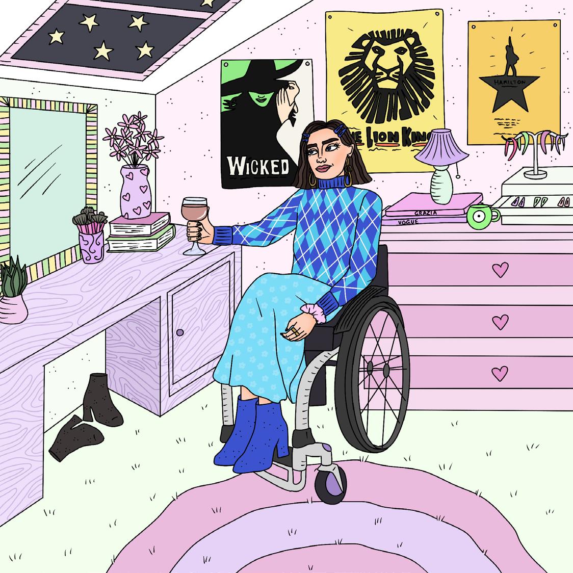 Holly: “People automatically believe my relationship with my wheelchair is a sad, angry tale. In reality it is the complete opposite! Although it took some time to feel this way, I have great love for my chair, it allows me to be independent, leave my bed, and be a social person. Perhaps one of the biggest misconceptions is that I’m ‘stuck’ in my chair or ‘wheelchair bound’. I can transfer to other surfaces, and I get out of my chair many times a day! An important thing about me and my chair that I don’t think many non-disabled people understand is that my chair feels like an extension of me and when someone touches it, pushes it or moves it (especially with me in it) without my permission I find it very challenging to explain to them that it feels like a violation of my space. After all, my back rest is relatively low so they are inches away from grabbing at my waist!”