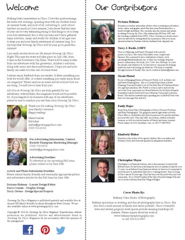 Kimberly Blaker For Advertising Information, Contact: Rachele Thompson-Marketing Manager (530) 519-0320 rachele@growingupchico.com Advertising Deadline: To advertise in our upcoming Fall issue, please contact us by June 30th. Article and Photo Submission Deadline: Please submit family-friendly and seasonally appropriate photos and informative articles for the Fall Issue by June 30th. DeAnna Holman - Layout Design/Editor Darci Crossin - Graphic Design Terry Givens - Design/Special Projects Growing Up Chico Magazine is published quarterly and available free at around 300 family-friendly locations throughout Butte County. We are also available online at www.growingupchico.com. Copyright © 2016 by Growing Up Chico Magazine. Reproductions without permission are prohibited. Articles and advertisements found in Growing Up Chico Magazine do not necessarily reflect the opinions of the management.