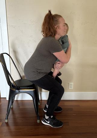 Young children can weigh 35 pounds. So one of several prescribed exercises is the weighted chair getup which helps mothers perform getting up and down many times a day with their little one with greater ease. (See picture) This and many others should be integrated both prenatally and postpartum as long as there are no medical contraindications or pain. This is why walking more or trying yoga are not adequate if you are asking your body to work in very specific ways.