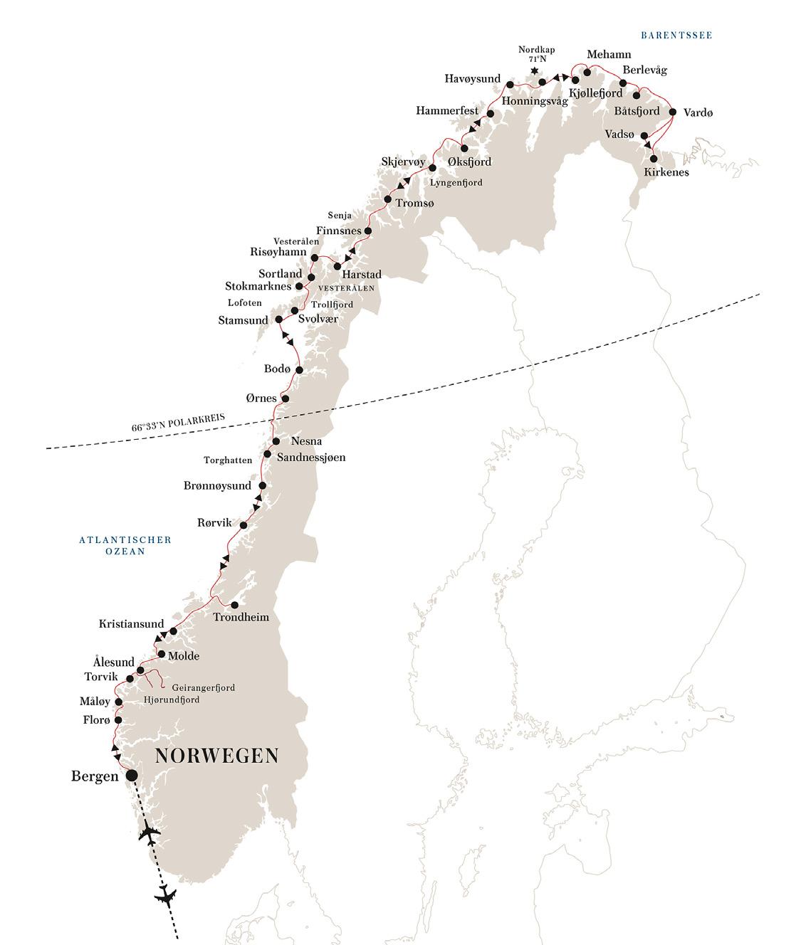 Unsere 12-tägige klassische Seereise die norwegische Küste entlang führt Sie zunächst in Richtung Norden, vorbei an Norwegens zahlreichen Fjorden und Bergen, bis nach Kirkenes und zurück gen Süden. Im Verlauf der über 4.500 Kilometer langen Route läuft Ihr Schiff 34 Häfen verschiedener Größen an und überquert zweimal die Grenze des nördlichen Polarkreises. Es ist die landschaftlich reizvollste Art, um die norwegische Küste zu bereisen.
