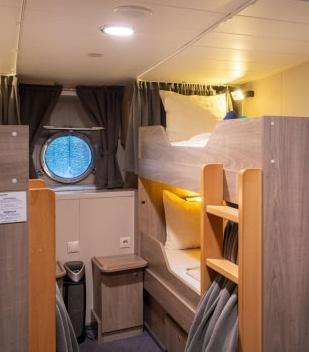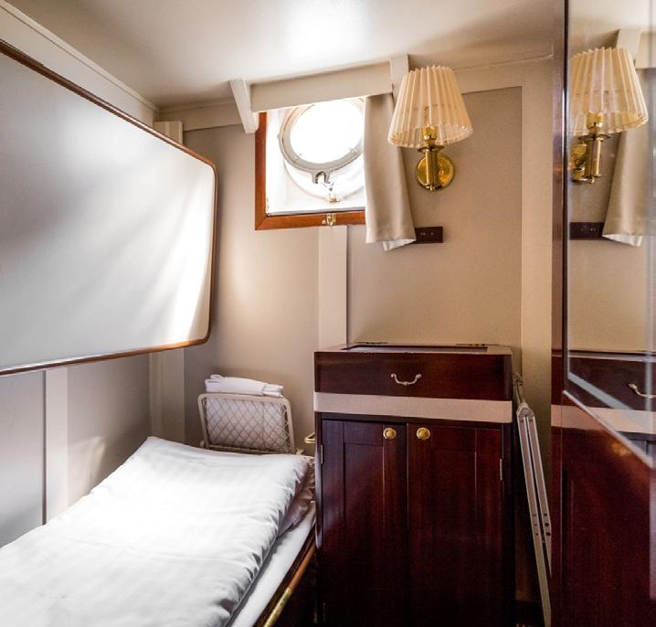 Die Kabinen haben ihren ganz speziellen Charme, sind aber klein. Fast alle Kabinen sind mit Etagenbetten ausgestattet Größenmäßig sind die Kabinen mit einem Schlafwagenabteil im Zug vergleich bar. Bringen Sie daher nicht zu viel Ge päck mit. Wir empfehlen eine kleine Tasche (der Platz unter den Kojen kann begrenzt sein). Größere Gepäckstücke können in einem Gepäckraum an Bord aufbewahrt werden.