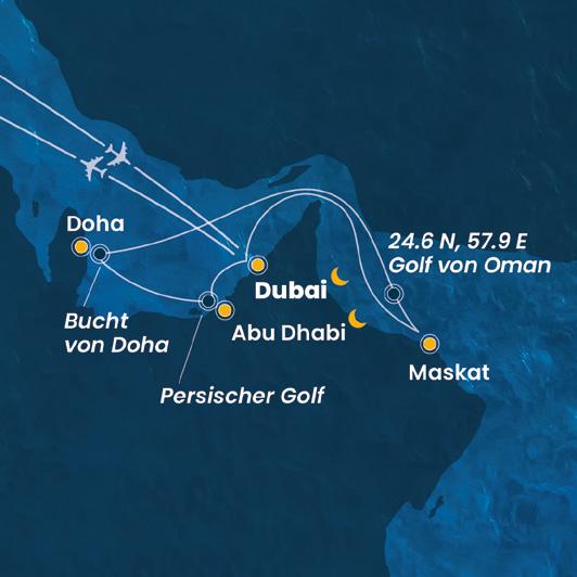 Route: Dubai · Abu Dhabi · Doha · Maskat · Dubai
