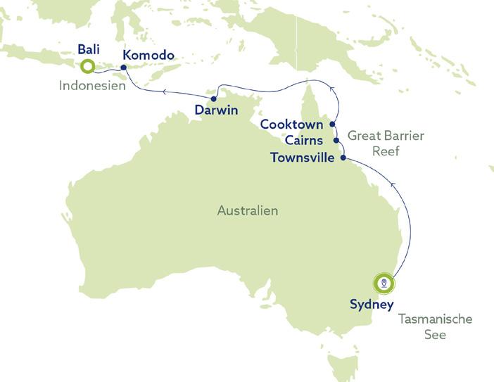 Route: Sidney • Townsville (Australien) • Cairns (Australien) • Darwin (Australien) • Komodo (Indonesien) • Benoa (Bali)