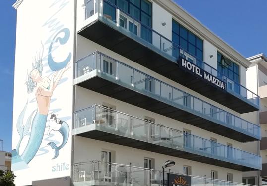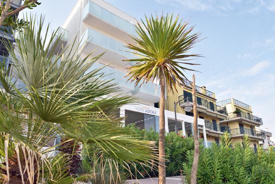 Ausstattung: Lobby mit Rezeption, Aufzug, Bar, Speisesaal, beheizter Whirlpool und Sonnenterrasse mit Meerblick im 5. Stock.