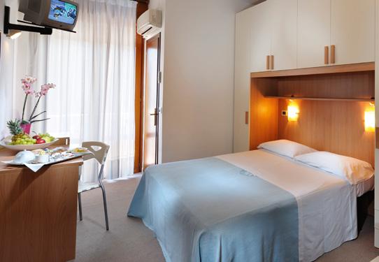 Zimmer: Dusche/WC, Föhn, Telefon, W-LAN (ohne Gebühr), Sat-TV und Klimaanlage, ca. 13m², teilweise mit Balkon.