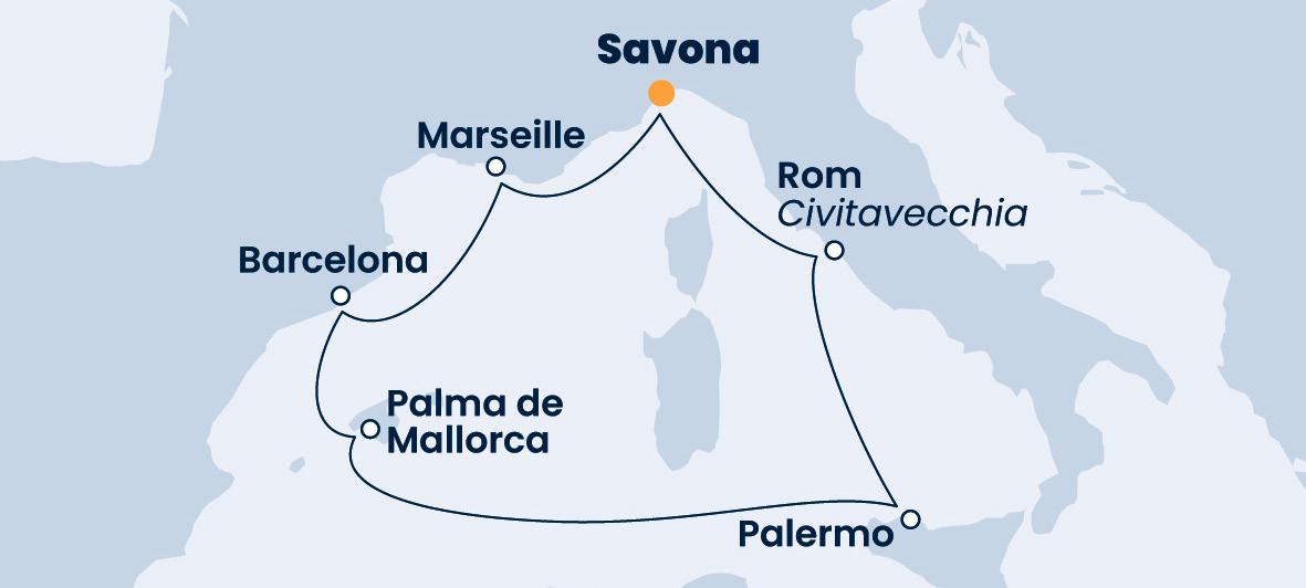 GENUA Italien BARCELONA Spanien Mittelmeer CIVITAVECCHIA (Rom) LA VALLETTA Malta MARSEILLE Frankreich PALERMO