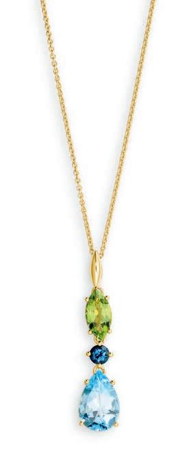 Peridot, Topas und Topas Londonblue, am liebsten gefasst in Gelbgold 585. Grün ist die Farbe des Lebens, Blau die Farbe der Träume - vereint verzaubern sie jeden Tag in einen Traumtag. Kettenlänge 42cm.
