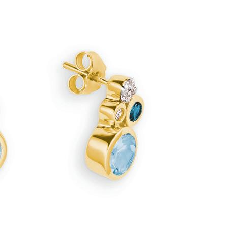 EIN STÜCKCHEN HIMMEL ... ... für unterwegs, das die Sonne zu dir durchlässt. Set in Gelbgold 585 mit Topas, Londonblue Topas und Brillant: Halskette 42cm und Ring jeweils mit Brill. 0,09ct, Ohrschmuck mit Brill. 0,12ct H/SI.
