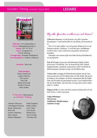 Hej alla Grunden-medlemmar och läsare! Hemsida: www.riksgrunden.se E-post: tidning@riksgrunden.se Telefon: 031-707 20 65 Adress: Svangatan 4A 416 68 Göteborg Formgivning: Grundens Reklambyrå Ansvarig utgivare: Andreas Oskarsson Redaktör: Elsa Leth Tankesmedjan: Emily Gunnarsson Anders Karlsson Ola Larsson Elsa Leth Hanna Swiesciak Kristin Svensson Mats Andrén