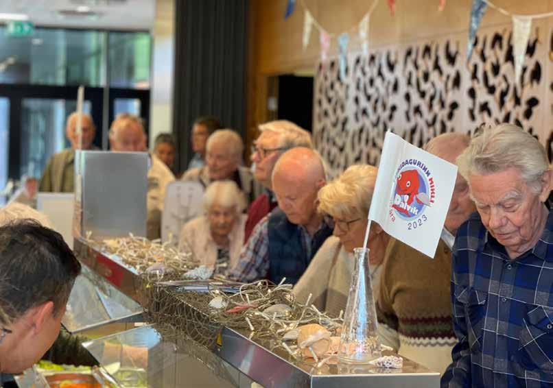 Hvert er vinsælasta smurbrauðið? „Reyktur lax og silungur er mjög vinsælt álegg. Margir vilja líka roastbeef. Annars er sennilega flatbrauð með hangikjöti vinsælast svona heilt yfir. Svo hef ég verið að bjóða upp á smurð heilhveitihorn líka. Íbúar kaupa stundum smurbrauð eða heilhveitihornin til að hafa sem kvöldmat og þá hef ég lánað þeim diska undir brauðið. Getur þú ekki komið því að í þessu viðtali að mig vantar þessa lánsdiska,“ segir hún og hlær þessum dillandi hlátri sem einkennir þessa lífsglöðu konu . „Ég smyr stundum aðeins of mikið og þá fer afgangurinn samdægurs upp á eitt þeirra