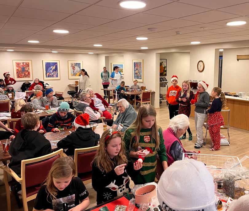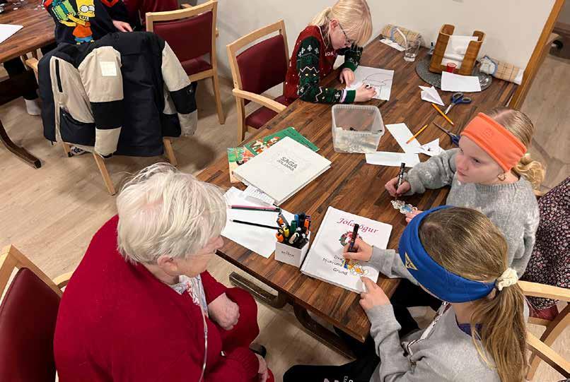 Jólasöngvar, sögur, hlátur, gleði og föndur. Þannig var andrúmsloftið á Litlu Grund þegar börn úr 5. bekk í Mýrarhúsaskóla á Seltjarnarnesi komu í heimsókn í upphafi aðventu. Það er ómetanlegt fyrir heimilisfólkið að fá þessa dásamlegu gesti í heimsókn. En það er ekki síður frábært fyrir unga fólkið að fá tækifæri til að kynnast öllum þessum langömmum og langöfum sem taka börnunum opnum örmum og hafa allan tíma í heiminum til að hlusta og dást að því sem ungviðið hefur fram að færa.