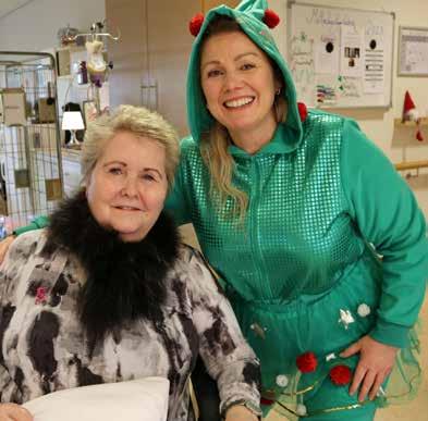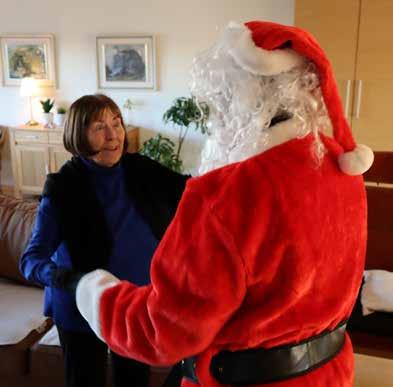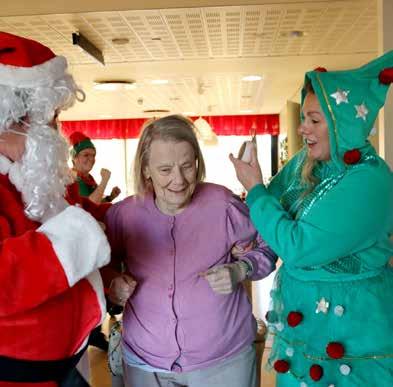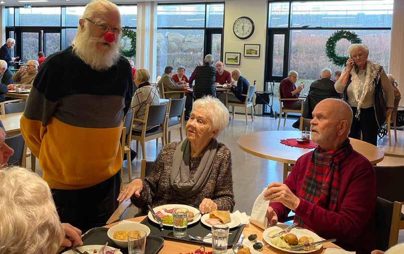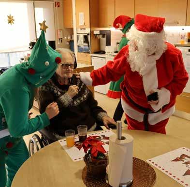 Það var jólalegt á Grundarheimilunum þegar boðið var upp á jólahlaðborð um miðja aðventu. Í Mörk klæddi starfsfólkið í eldhúsi og vinnustofu sig upp í jólabúninga og heimsótti allar hæðir og bauð upp á sérrí með jólamatnum. Þessu skemmtilega fólki var að vonum vel tekið og stundum var jafnvel stiginn dans. Jólasveinninn í hópnum tók hlutverk sitt alvarlega og minnti ótrúlega mikið á Bjúgnakræki.