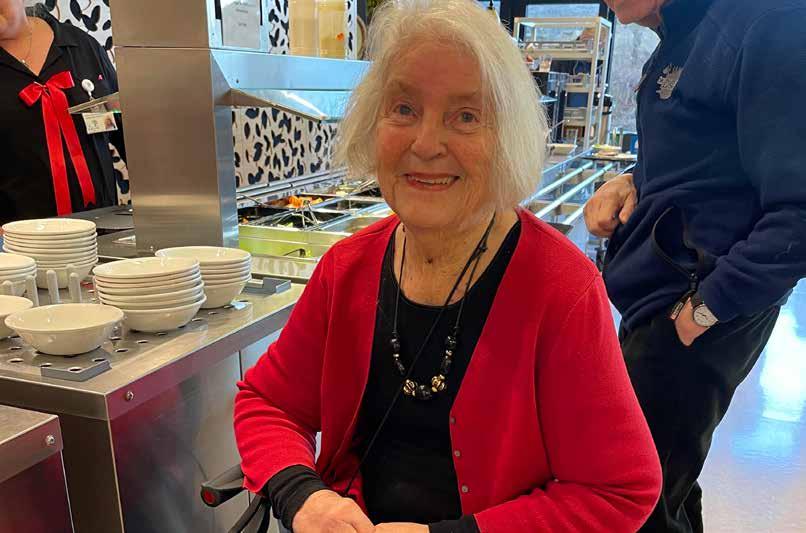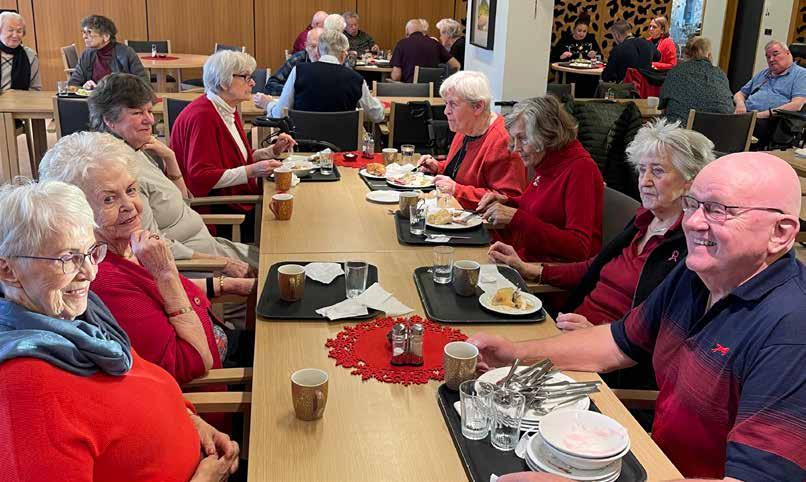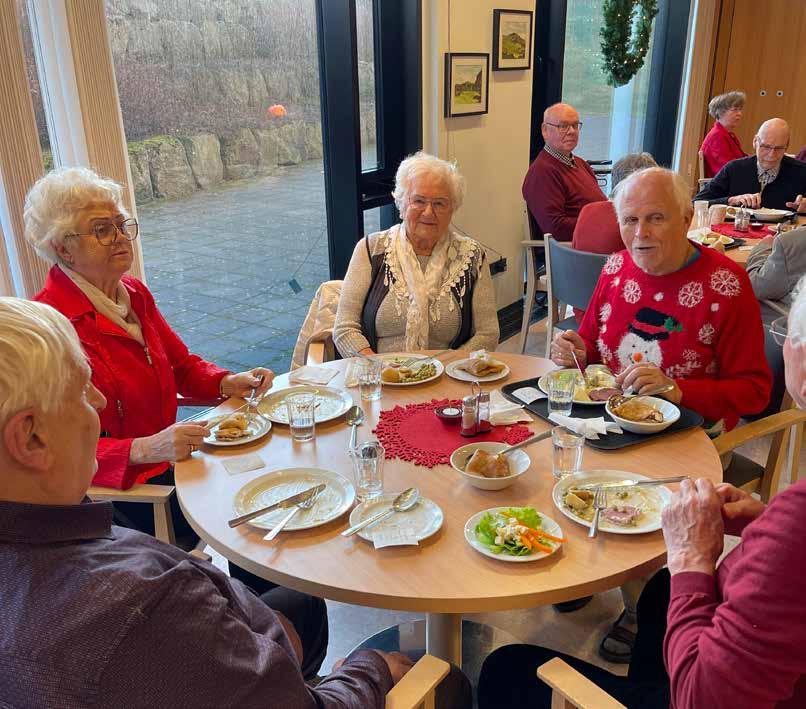 Það er kátt á hjalla í matsalnum þegar íbúar koma saman í hádeginu og ekki spillir nú fyrir kátínunni þegar allir mæta í rauðu og borða hátíðarmat.