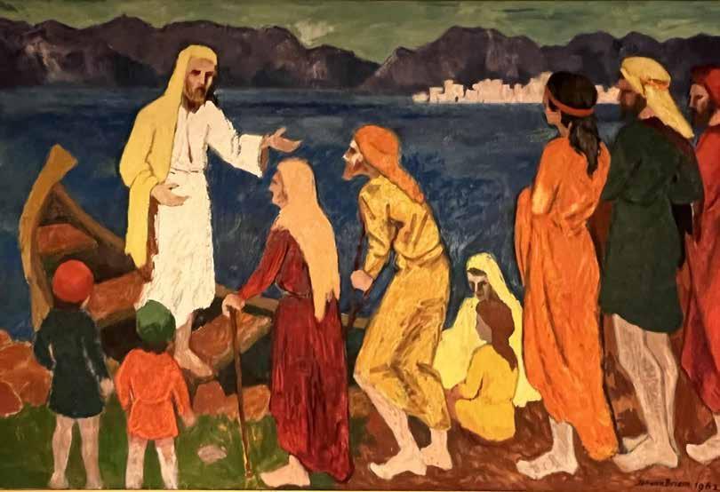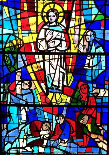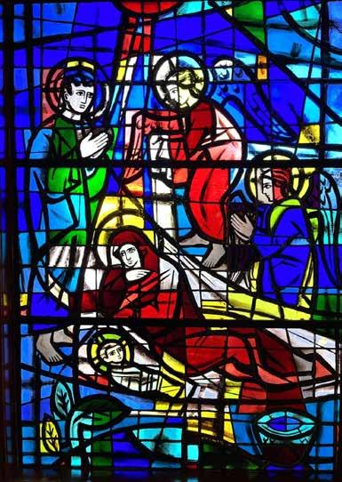 Báðum megin á myndinni eru tveir karlar, fullir lotningar andspænis meistaranum og aðrir tveir við fætur hans og annar þeirra nokkuð hugsi. Litasamspilið gerir myndina í senn fjörlega og hátíðlega. Þá skal bent á tré með laufblöðum vinstra megin. Kannski er það tilvísun til skilningstrés góðs og ills. Í þessum glugga, sem hinum fyrri, renna saman hefðbundin mótíf sem og óhlutlæg.