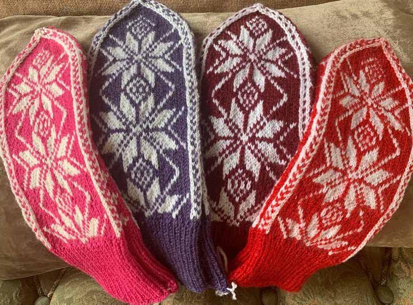 Það er ekki mikið sem hún fær fyrir en að minnsta kosti nóg fyrir garninu, segir hún og brosir svo blíðlega eins og henni er lagið. „Mér finnst gott að hafa eitthvað fyrir stafni og sit hér við gluggann í Mörk og prjóna þegar ég á lausa stund.“ Vettlingana prjónar hún í ýmsum litum.