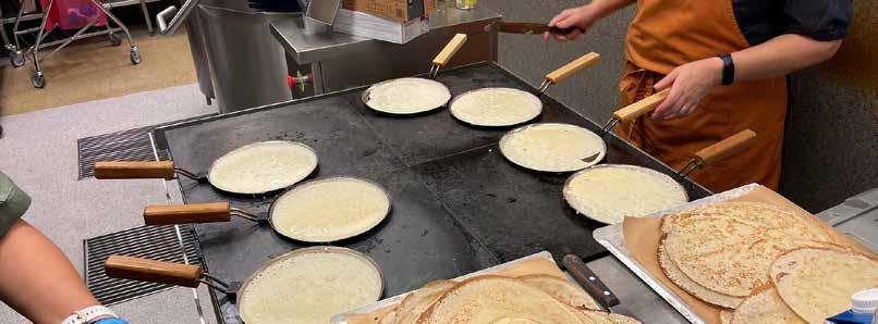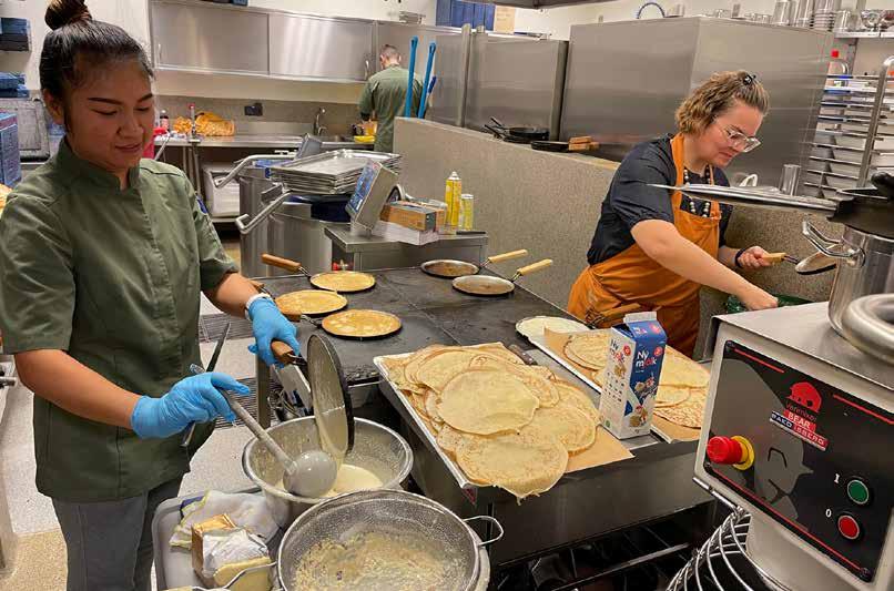 Það hefur skapast sú hefð á Grundarheimilunum að bjóða upp á hangikjöt með tilheyrandi meðlæti þann 1. desember og bjóða upp á rjómapönnukökur í eftirmat. Þá er ekkert annað að gera en að bretta upp ermar eins og þær Rakel og Chutima gerðu og baka á sjö pönnum á annað þúsund pönnukökur. Geri aðrir betur.