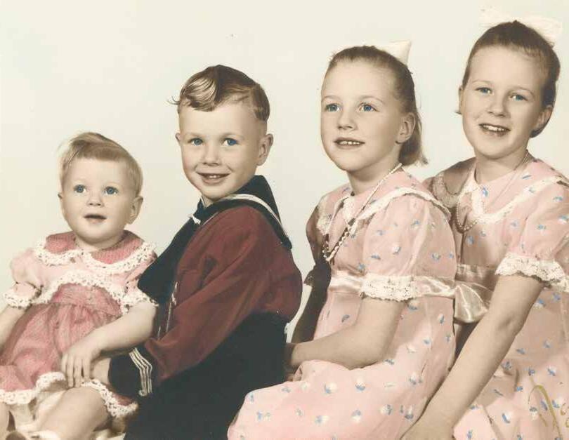 Börnin fjögur í heimasaumuðum fötum eftir Önnu Sigríði.