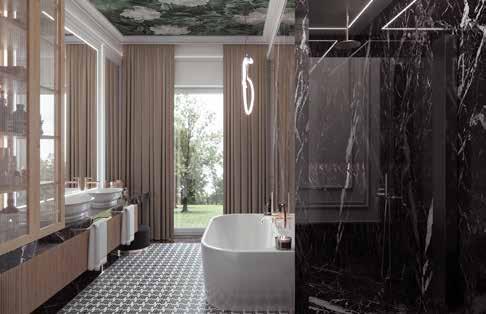 a wielkie formaty – doskonale sprawdzające się nie tylko na ścianach i podłogach, ale również w roli blatów i okładziny konstrukcji meblarskich – czynią go ekskluzywnie eleganckim. Allure zaprojektowana została w całym formatowym spektrum (30 x 60, 60 x 60, 45 x 90, 90 x 90, 60 x 120, 120 x 120, 120 x 270 cm), z uwzględnieniem dwóch formatów w cieńszej, plastycznej formule Ductile® (60 x 120, 90 x 270 cm) i aż pięciu wariantach mozaikowych. Wykończenie Soft Bush Hammered sprawia, że powierzchnie w pełni oddają fakturę naturalnego kamienia, urzekając zmysł dotyku, a wykończenie Anti-Slip pozwala stosować wzór w realizacjach zewnętrznych.