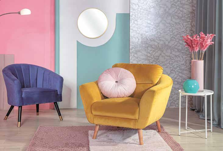 zaskoczeniem duet fioletu z zielenią albo oranżu z niebieskim. Ściany w maksymalistycznych wnętrzach nie są szare lub białe, często pojawiają się na nich róż, granat czy wspomniane zieleń i fiolet. Za pomocą kolorów wyróżnia się poszczególne strefy pomieszczenia – to jeden ze sposobów porządkujących aranżację. Na tle oliwkowej ściany dobrze pracuje różowy fotel z fioletowymi poduszkami, w towarzystwie stolika o szklanym blacie i podstawie w kolorze butelkowej zieleni. To odpowiednio zaplanowana taktyka – oba z dwóch odległych od siebie kolorów pojawiają się w dwóch odcieniach. I wszystko do siebie pasuje!
