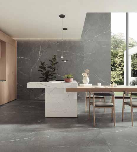 Ceramicznych wariantów kamienia jest pięć – od ciemnoszarego Negres i srebrnego Soapst, przez jasnobeżowy Macaub i beżowoszary Piasen, bo biały Ardesi – wszystkie w perfekcyjnie autentyczny sposób naznaczone są użyleniem i ziarnistością prawdziwego materiału oraz występują w pięciu formatach o grubości 6,5 mm: 120 x 260, 120 x 120, 60 x 120, 60 x 60, 30 x 30 cm (mozaika).