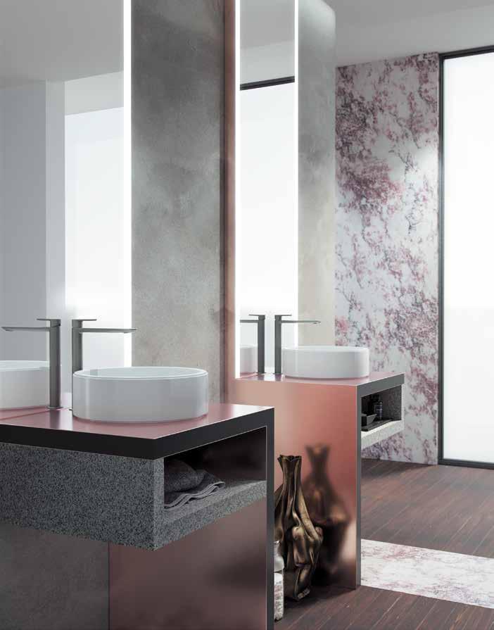 Monolityczna konstrukcja wolnostojącej umywalki z pewnością przyciągnie wiele spojrzeń. Mocna, wyoblona baza gustownie gra tu z delikatnym rozłożystym brzegiem otwierającym się niczym kielich tulipana. Miski toaletowe wiszące i stojące, bidety oraz pisuar dopełniają aranżację kształtami nawiązującymi do projektu umywalki. Organiczną formę odzwierciedla także wolnostojąca wanna – największy kwiat, jaki zdołasz umieścić w łazience. No i te meble… Lity dąb lub orzech amerykański w pięciu gustownych wariantach kolorystycznych wykończonych na wysoki połysk lub w satynie, z ukośnymi, niezwykle precyzyjnie wykonanymi krawędziami –klasa sama w sobie.