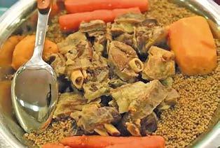 Lourdes Giménez, ÁrticoCuscús (la receta original se elabora con cuscús negro, pero si no es posible encontrarlo se puede sustituir por cuscús blanco), cebolla, tomate rallado, ajo, zanahoria, berenjena, carne de pollo o ternera, caldo de carne o una pastilla de caldo, vino tinto (opcional), aceite, agua y sal.