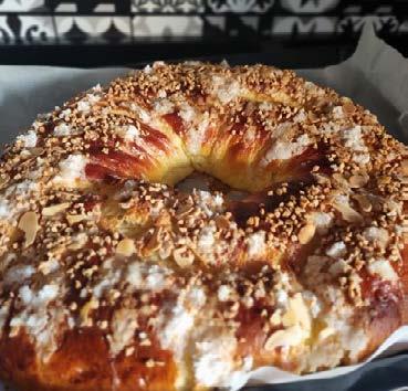 6. Colocamos la masa, ya con la forma de roscón, en una bandeja con papel de horno. La pintamos con huevo batido y decoramos a nuestro gusto.