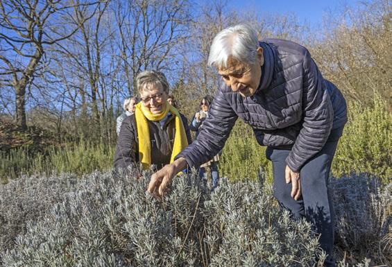 L’Àngels i la Mercè fent una ullada a l’espígol del jardí botànic.