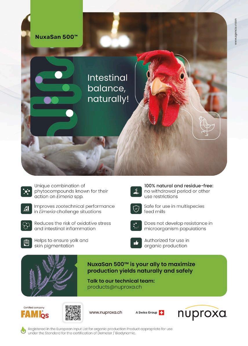 In poultry, we delve into the importance of low-protein diets, a strategy that balances performance with sustainability by reducing nitrogen emissions. Complementing these technical perspectives, we also examine the role of vitamin E and polyphenols as powerful antioxidants, supporting animal health and resilience in increasingly demanding production systems.