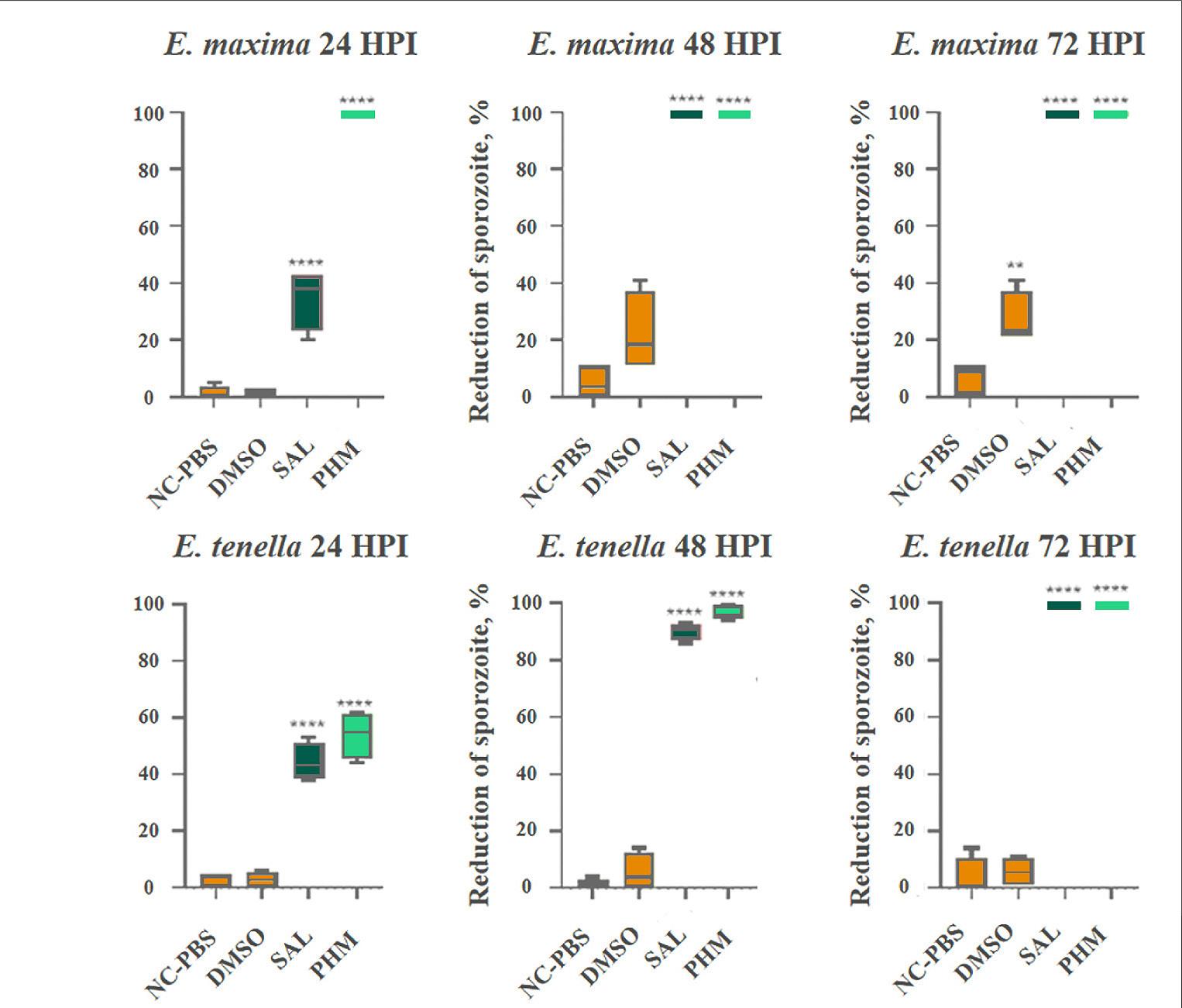 These reductions were very similar to salinomycin . However, in E. maxima, the polyherbal product completely eliminated sporozoites within 24 hours. At the same timepoint, salinomycin reduced E. maxima sporozoites by only 34%. The results of the sporozoite reduction percentages for both species are shown in Figure 1.