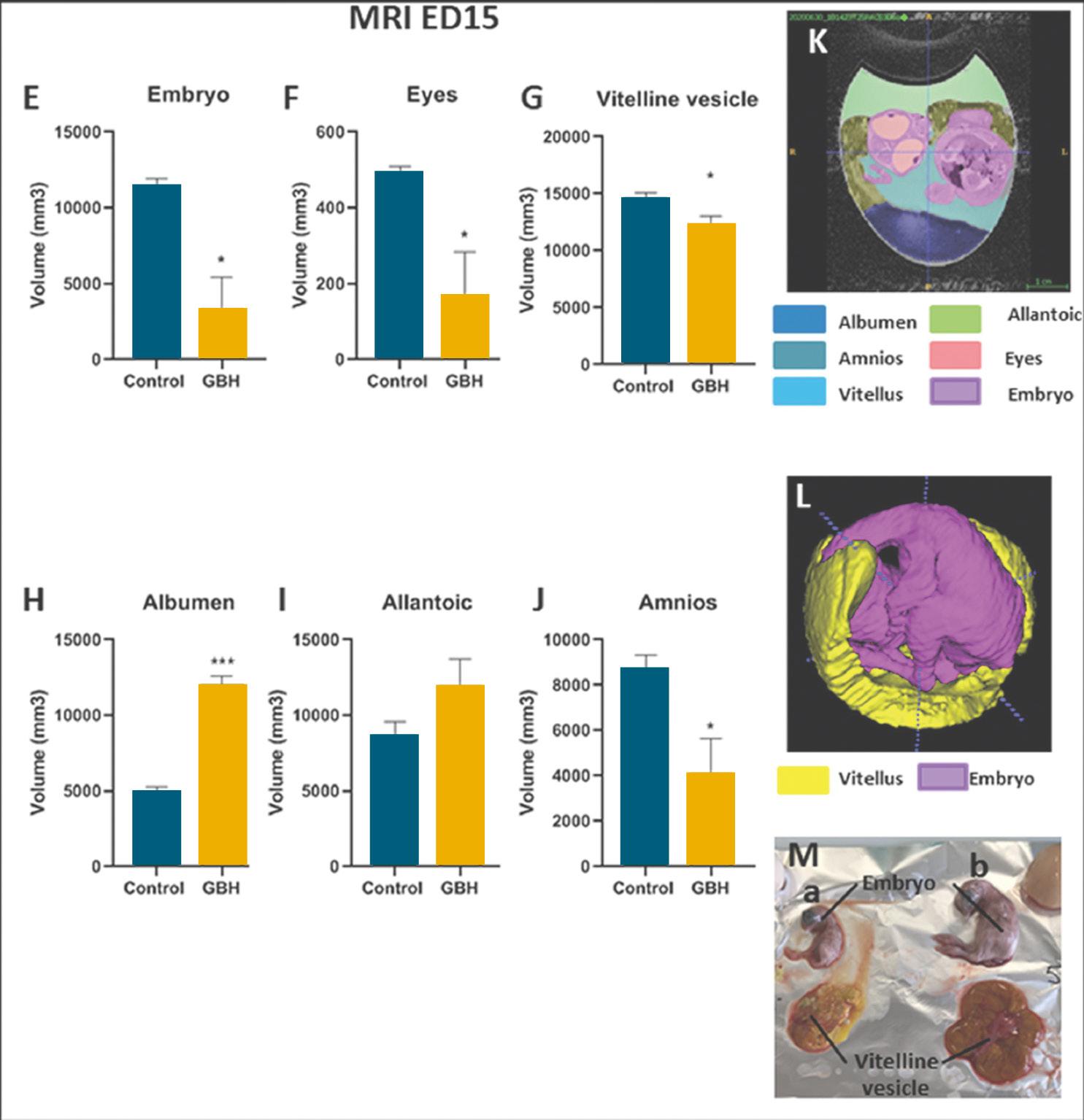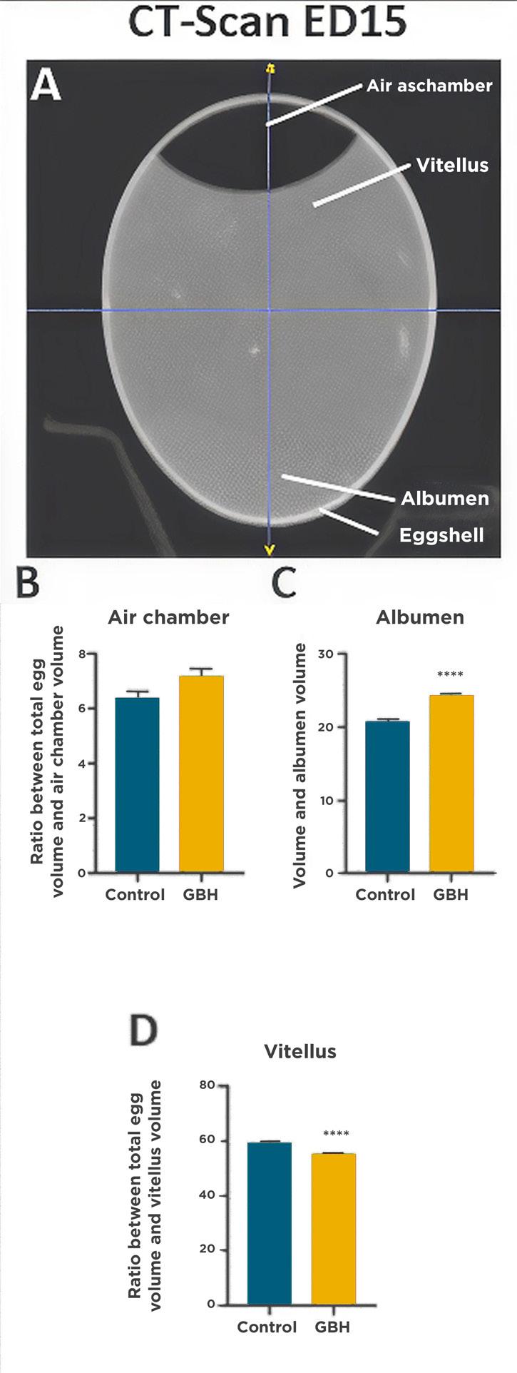 Figure 3. Computerized tomography and Magnetic Resonance Imaging analysis of incubated eggs at ED15. Representative picture of A) analyzed incubated eggs at ED15 by CT-Scan; B) Ratio between the total egg volume and the air chamber volume, C) the albumen volume and D) the vitellus, respectively (n = 10 eggs per group). E) Volume of the embryo body, F) Volume of the eyes of the embryo, G) the vitelline vesicle, H) albumen, I) allantoic, and J) amnios determined by analysis of MRI images at ED15 (n = 4 per group). Source: Estienne et al. (2022).