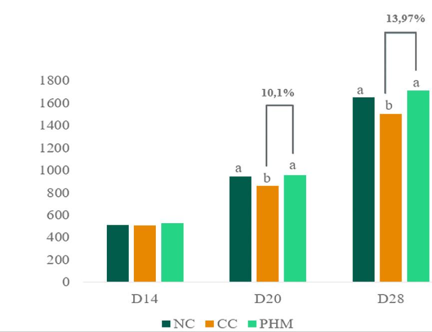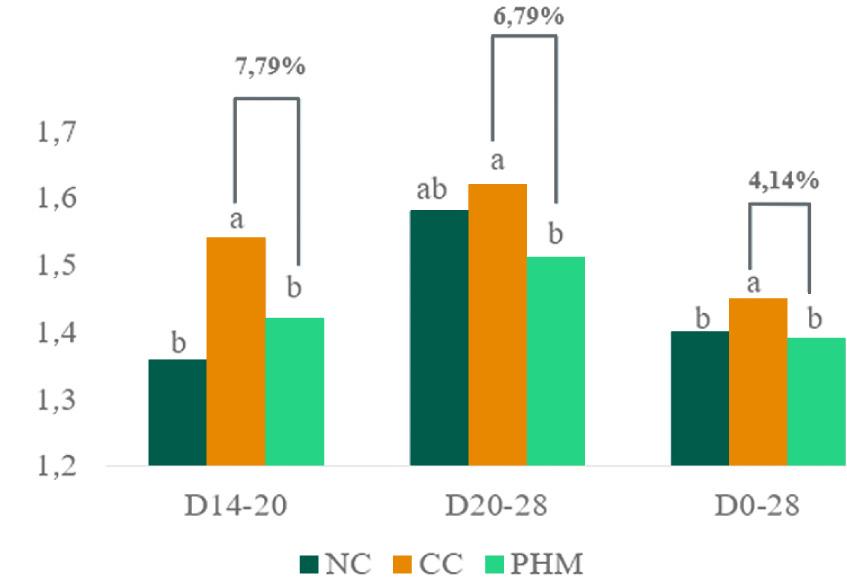 the PHM group was 10.1% higher than CC; at day 28, the increase was 13.97%. Feed intake and feed conversion ratio were also improved with polyherbal supplementation FCR decreased by 7.79% (day 14–20), 6.79% (day 20–28), and 4.14% (day 0–28) in PHM compared to CC. The values were nearly close to those of the non-challenged control.
