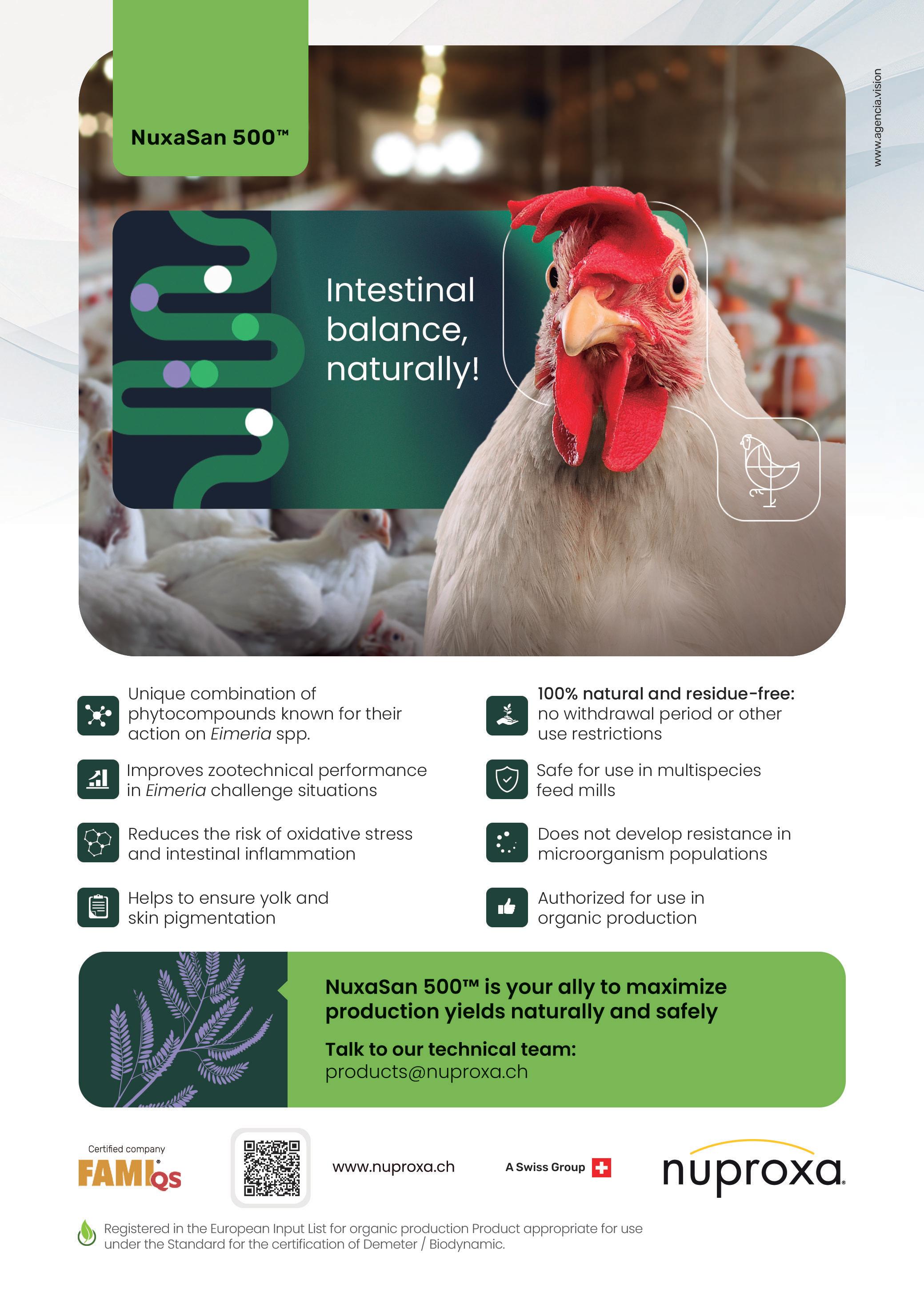 These combined findings from both in vitro and in vivo trials showed beneficial effects on gut health under Eimeria challenge. They provide evidence that NuxaSan 500® not only helps recovery during infection but also helps maintain intestinal integrity and overall zootechnical performance. Most importantly, these effects were observed without relying on conventional synthetic anticoccidials.