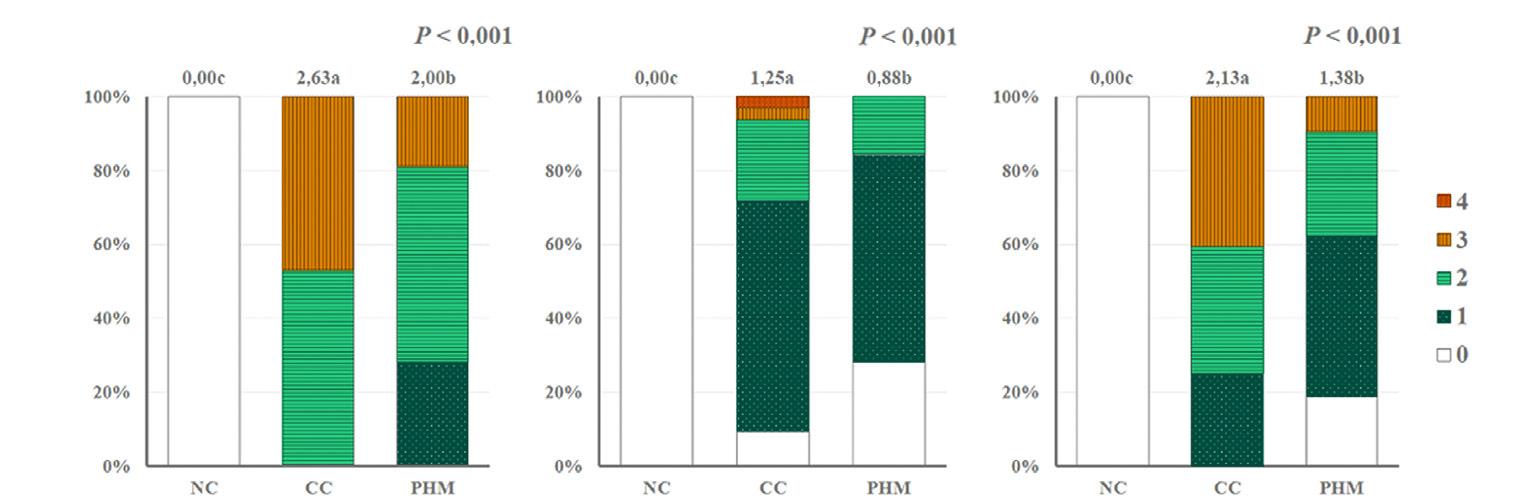 fewer severe lesions in the duodenum and ceca. Besides, visual inspection showed less swelling, blood clots, and mucus in PHM-treated birds compared to untreated challenged birds.