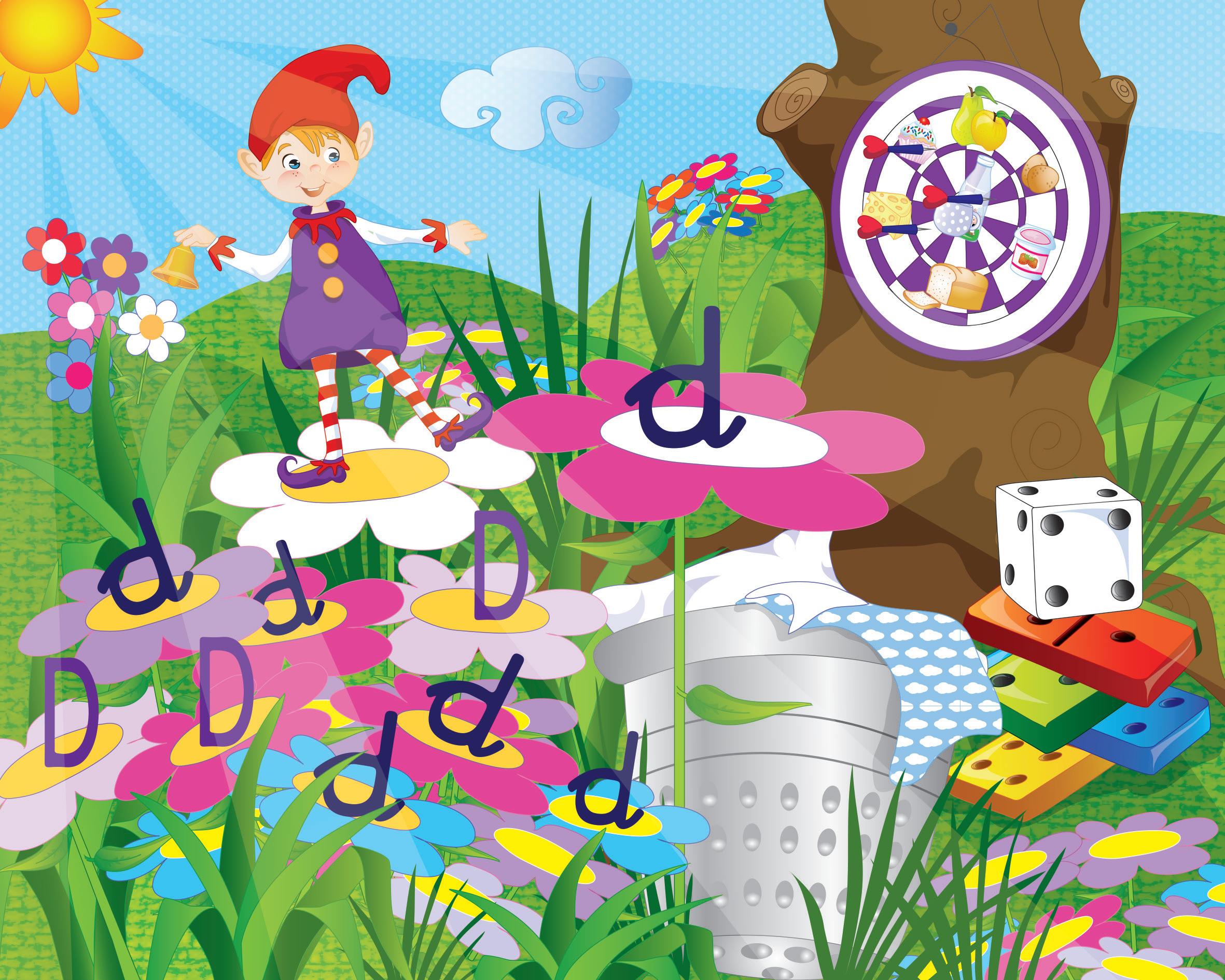 ¿A que a veces os cuesta un poco despertaros por la mañana? ¡Claro! ¡Es normal! Pero hay que levantarse temprano para ir al cole, hacer deberes, ir al médico, al dentista… Incluso los sábados y los domingos hay que despertarse para hacer deporte, divertirse o, por ejemplo, ver a los abuelos. En el Jardín de las Letras hay un duende que se encarga de despertar a todos con dulzura y de forma divertida, para que empiecen el día de buen humor. Se llama Dindón y duerme dentro de un dedal, debajo de las flores en las que crece la letra “d”. Es un duende delgadito y algo despistado pero muy alegre, al que le gusta jugar al dominó y disparar dardos a la diana. Cada mañana toca su campanilla dorada, DIN-DON, DIN-DAN, DIN-DON, DIN-DAN, y dice: