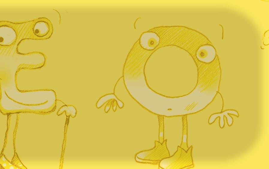Por ahí viene la O, que parece una rosquilla. Entra rodando ¡y casi se choca contra una silla! La O quiere ser oculista, para que sus pacientes lo vean todo bien.